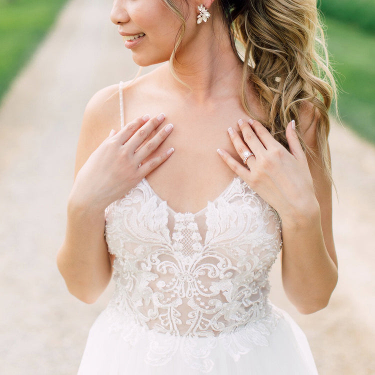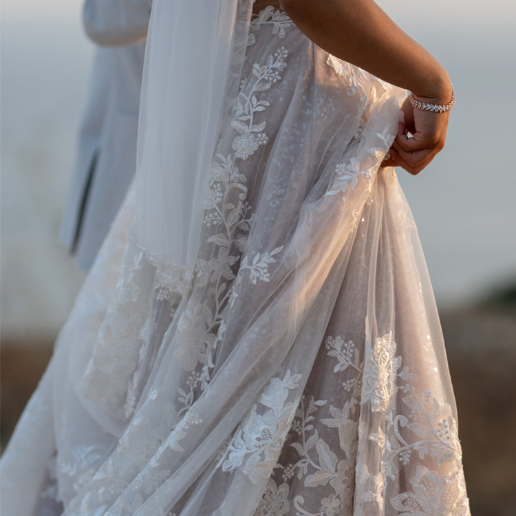 Super soft French tulle and French lace underneath, 3D lace applqiues with mixed beads, we love all the delicate details on Genna's dress.