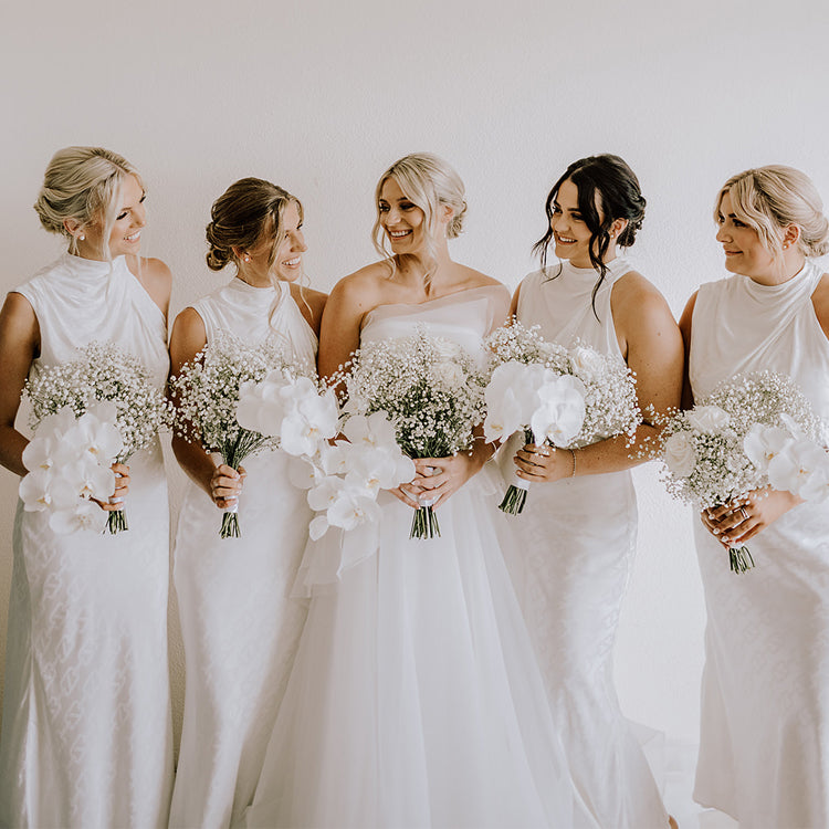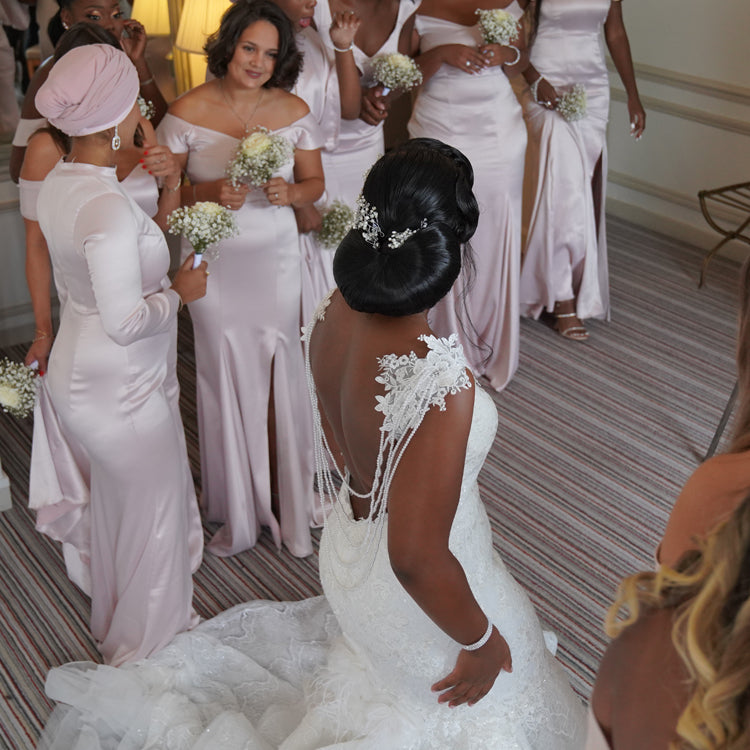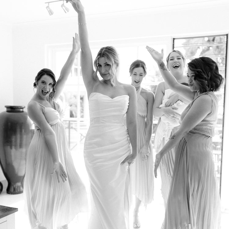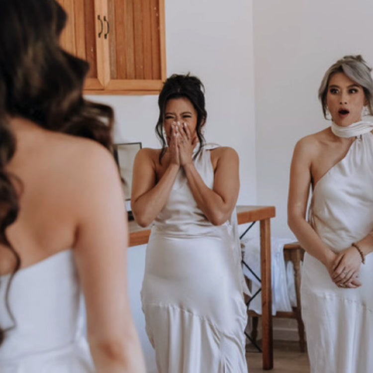 Bridesmaids react with joy seeing the bride in her BridalMelody wedding dress.