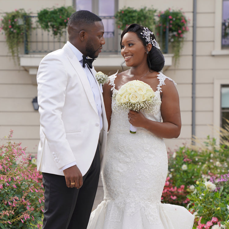 Bride laughing with groom among flowers in a beautiful BridalMelody gown
