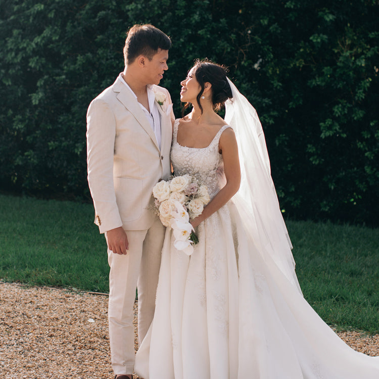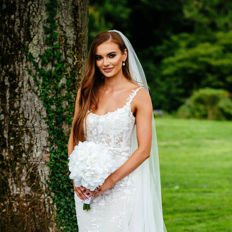Elegant bride Hazel poses in custom wedding dress with bouquet, perfect for outdoor bridal fashion inspo.