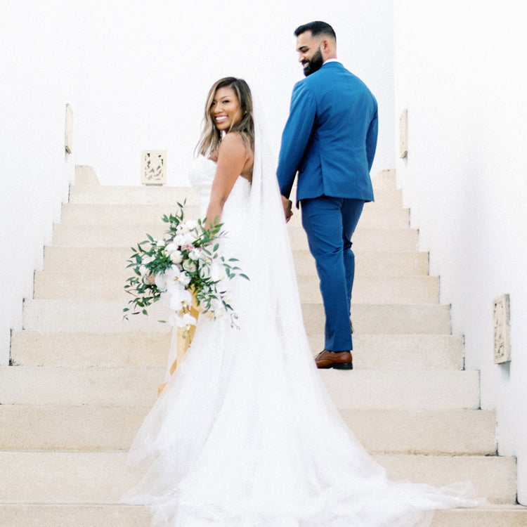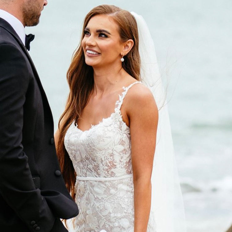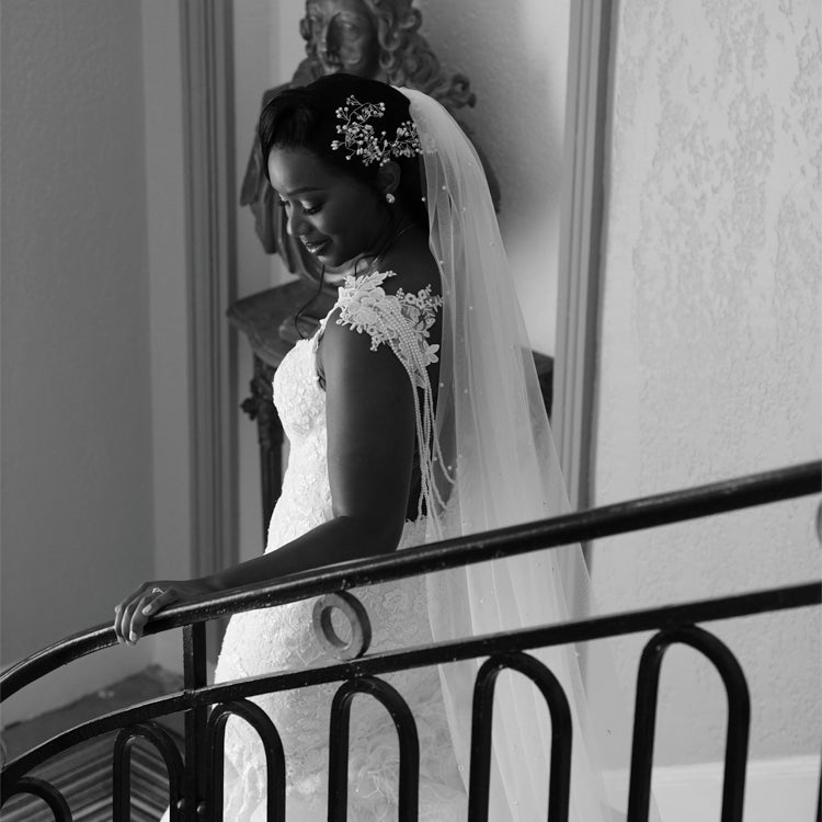 We are obsessed with Shayla's Gorgeous custom veil. The matching lace appliques on the trim make it a perfect bridal look.