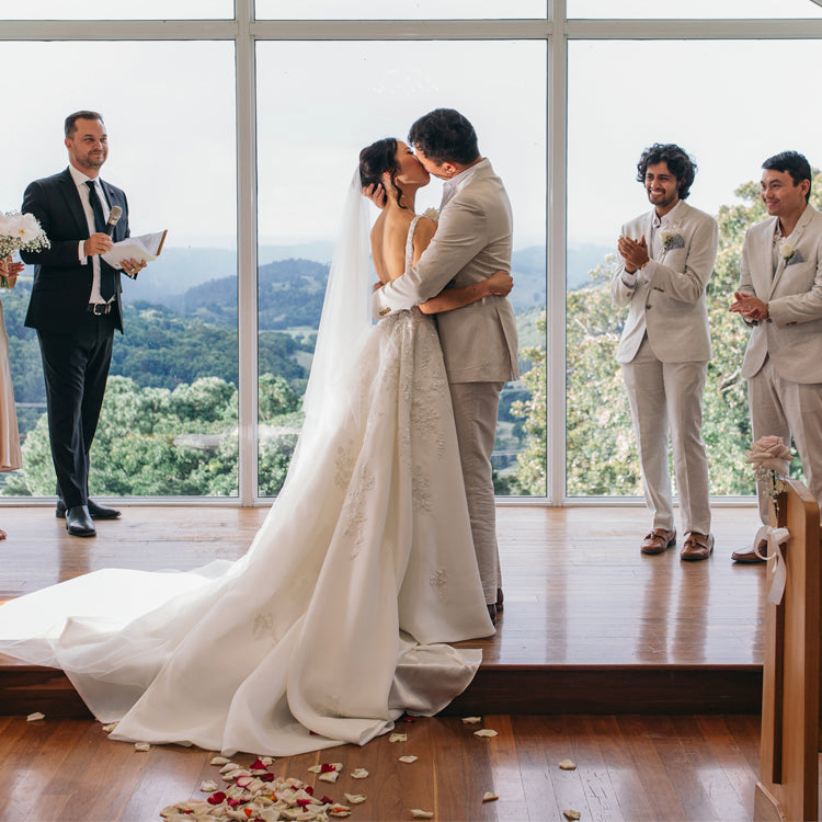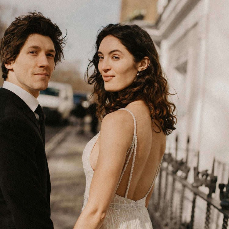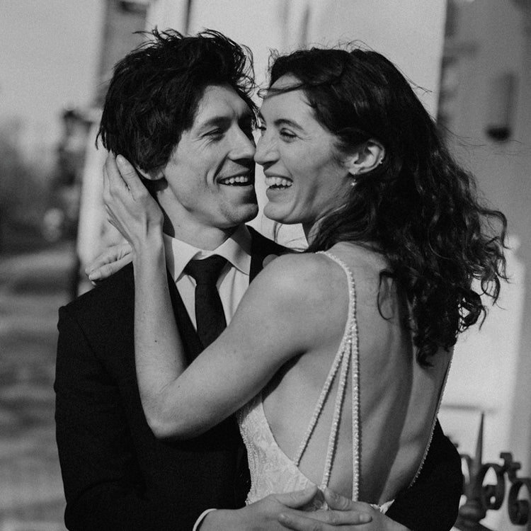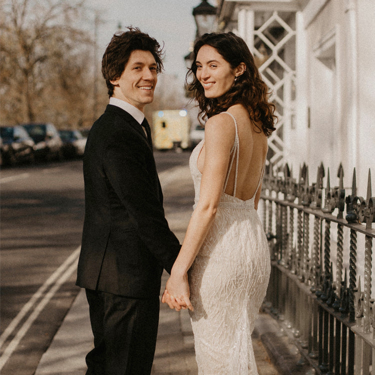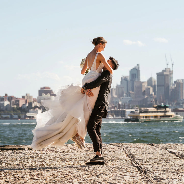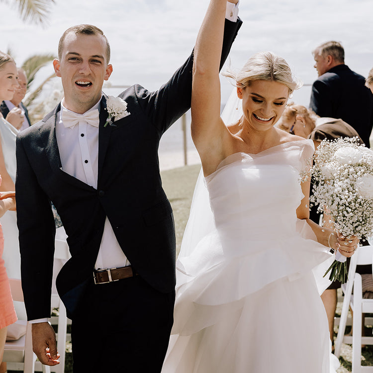 Bride and groom celebrate in custom wedding dress, ideal for bespoke wedding inspiration.