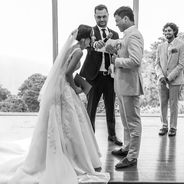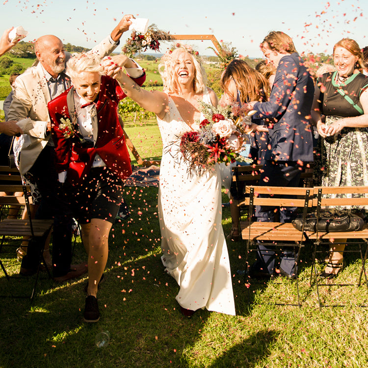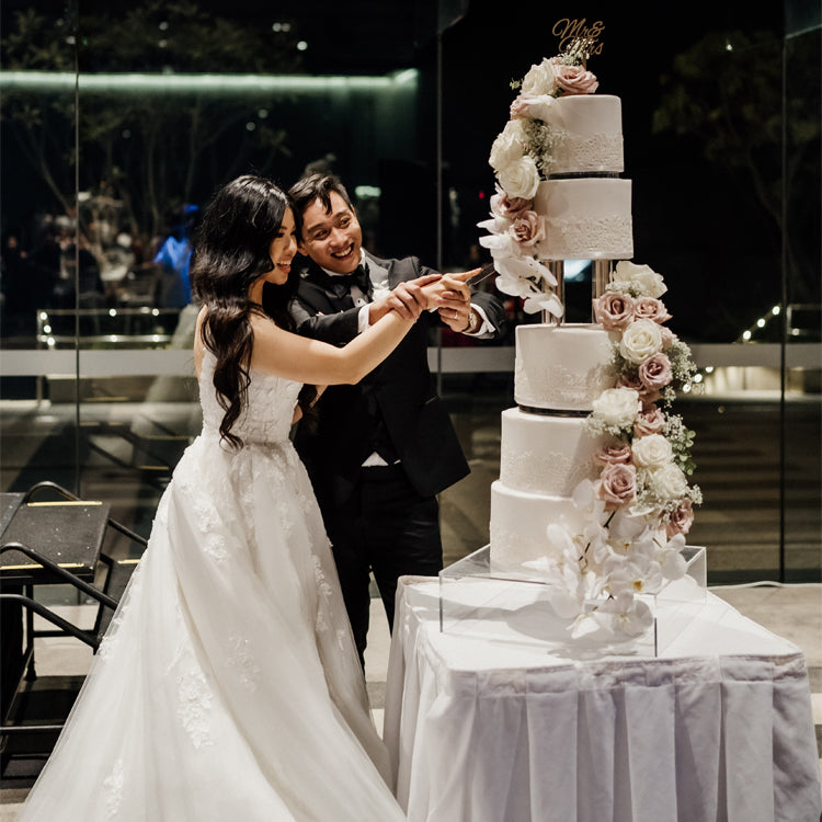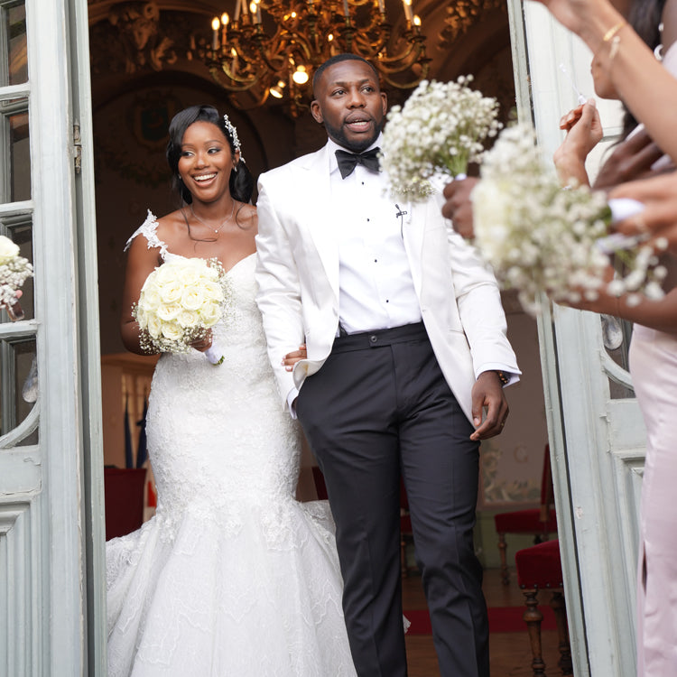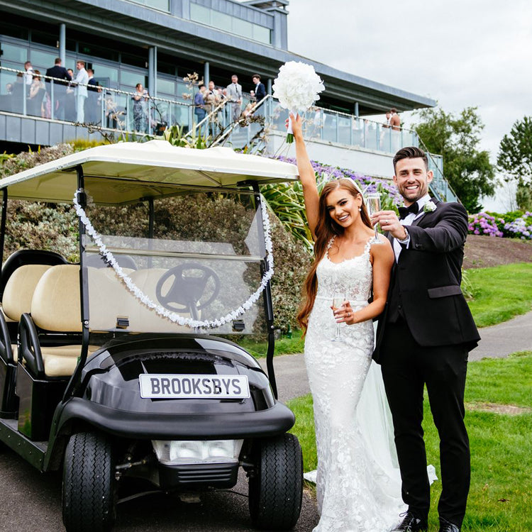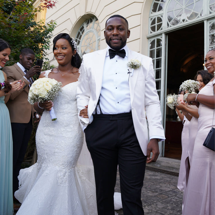 Bride and groom celebrate in custom wedding dress, ideal for bespoke wedding inspiration.