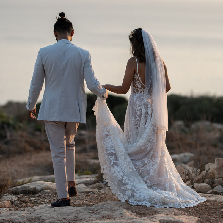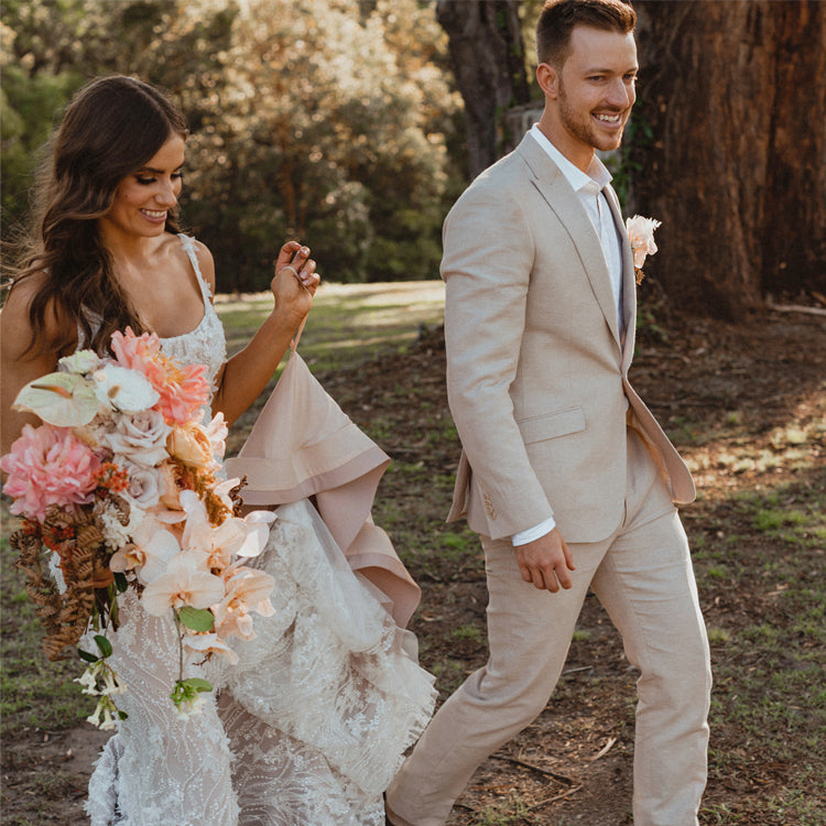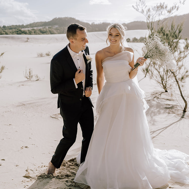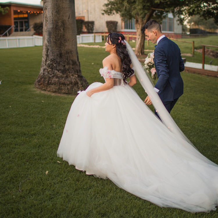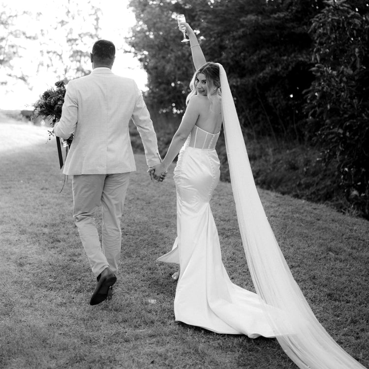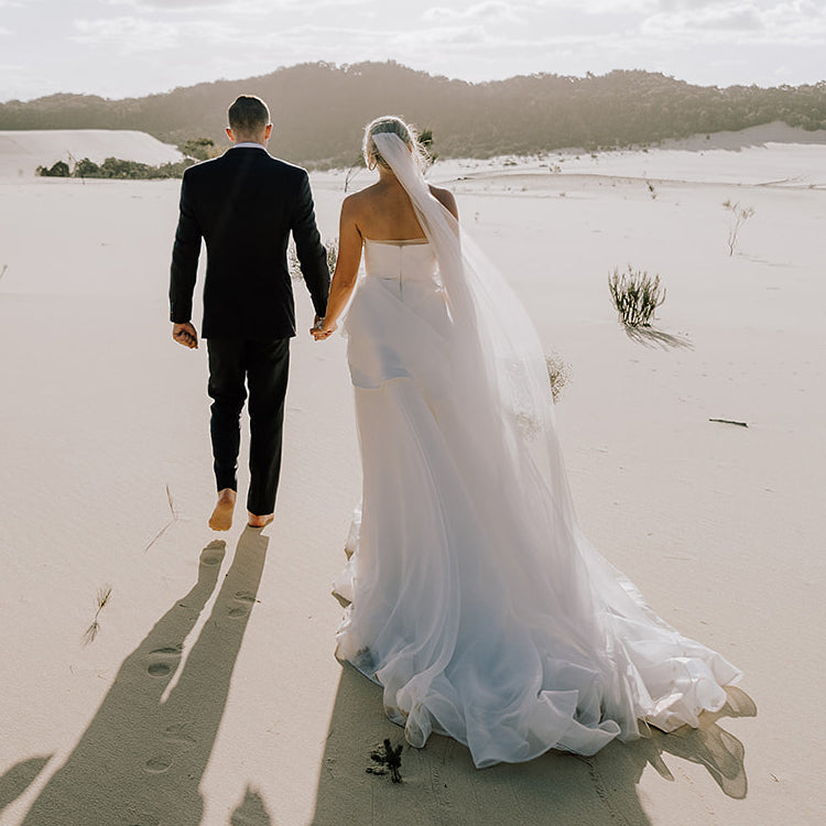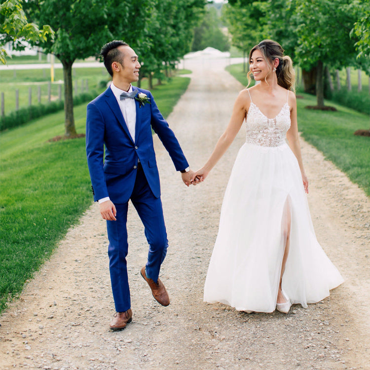 Couple walks hand-in-hand, bride in a stunning BridalMelody gown. Ideal for showcasing romantic outdoor weddings and custom bridal fashion。