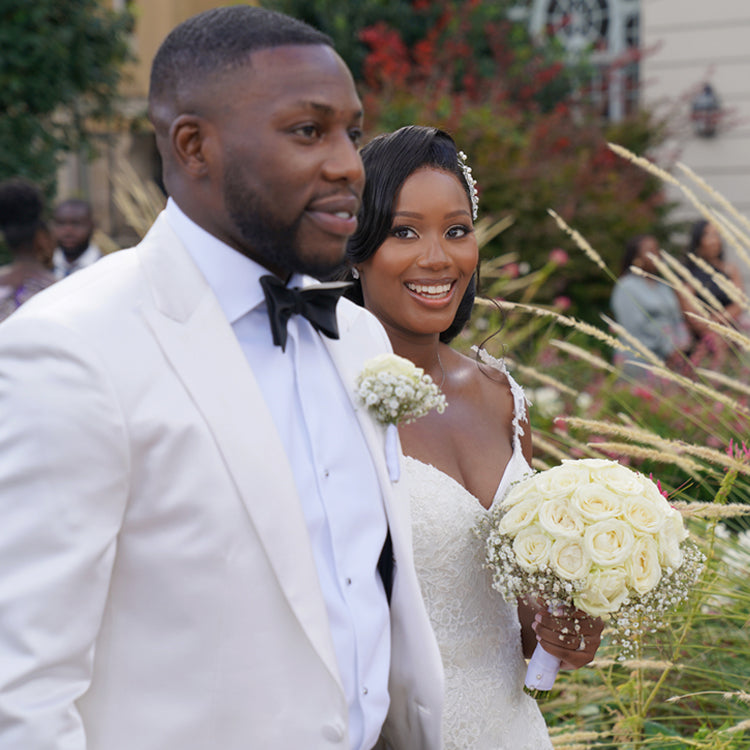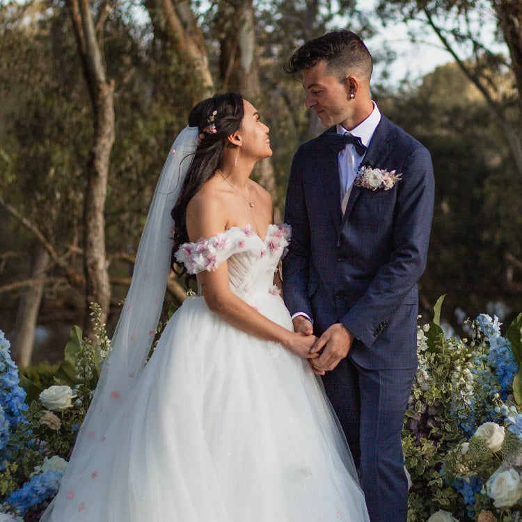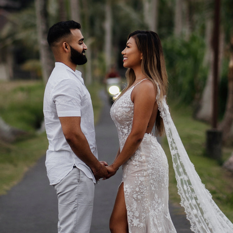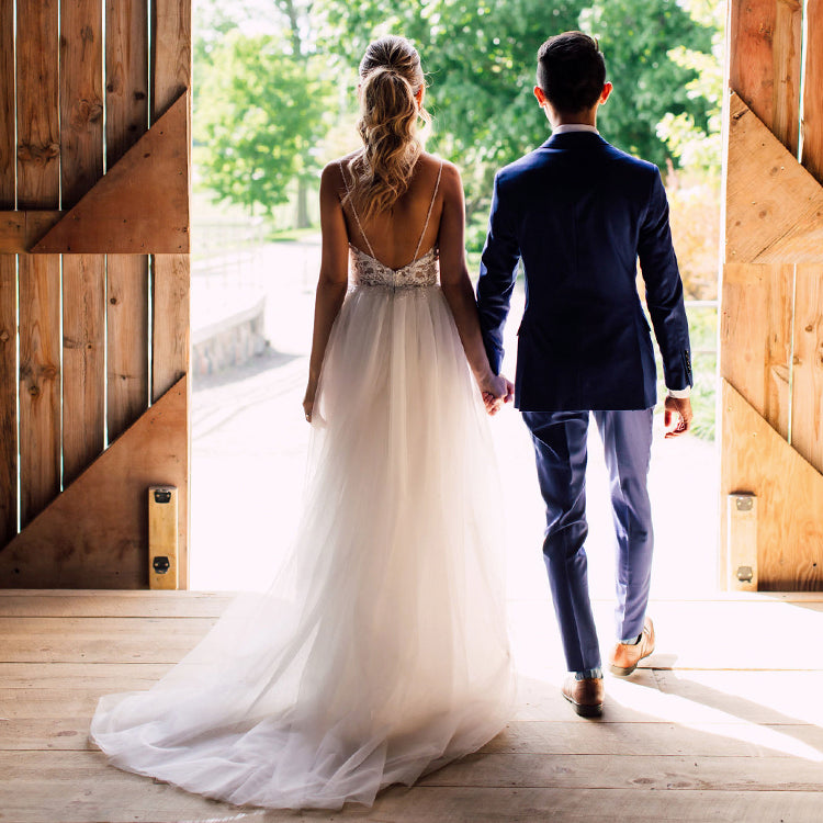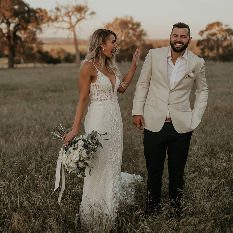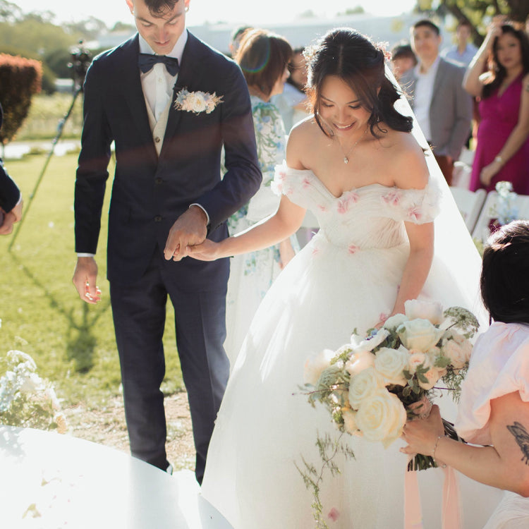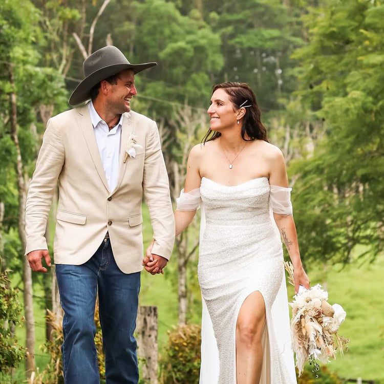 Couple walks hand-in-hand, bride in a stunning BridalMelody gown. Ideal for showcasing romantic outdoor weddings and custom bridal fashion。