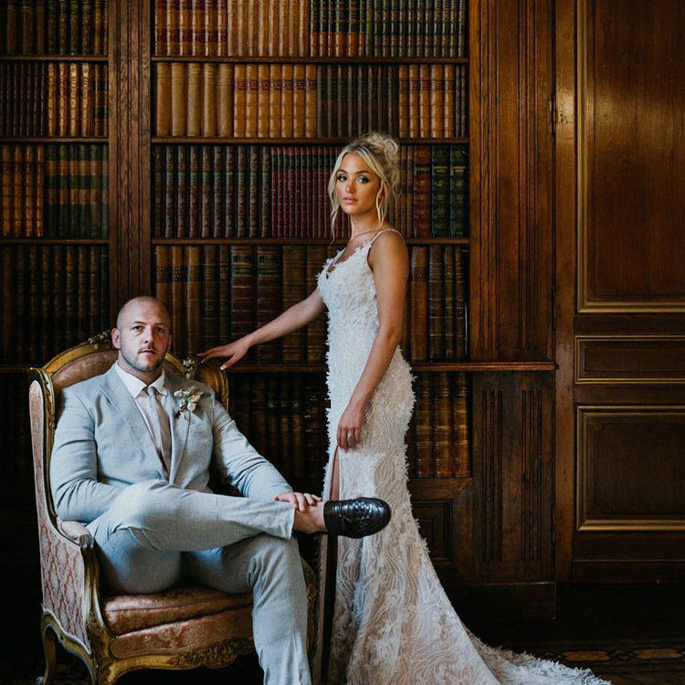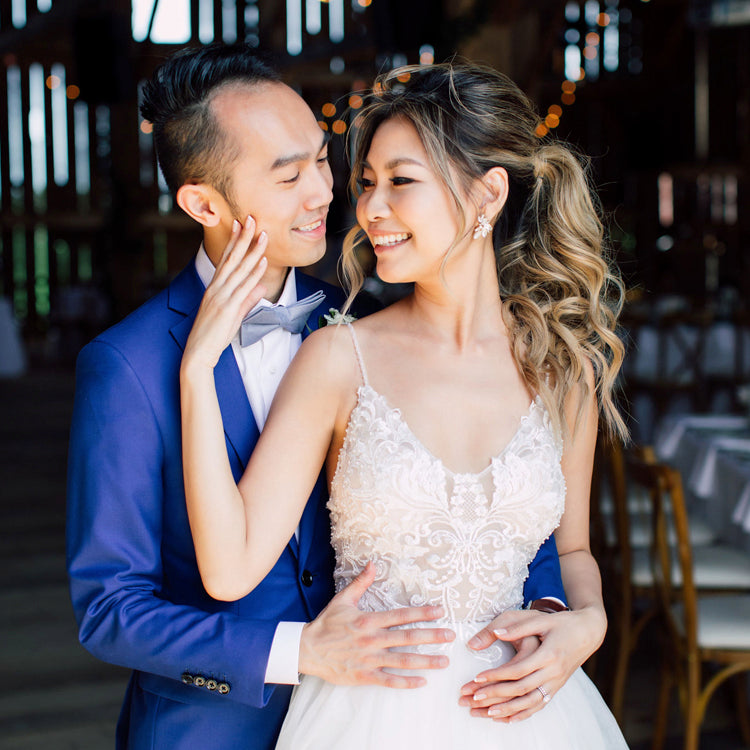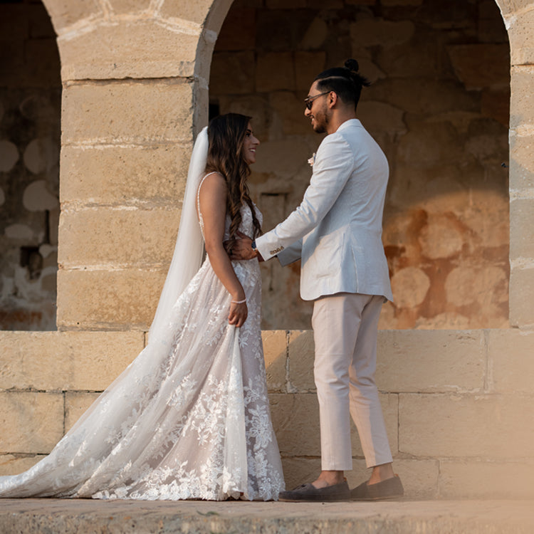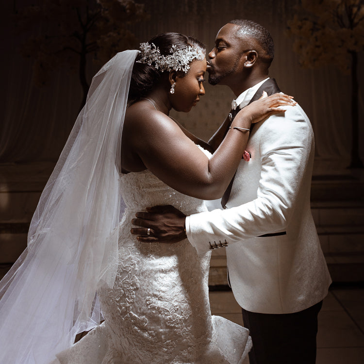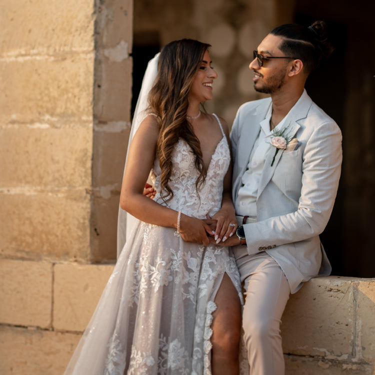 BridalMelody bride and groom in a sophisticated setting, showcasing a stunning lace wedding gown