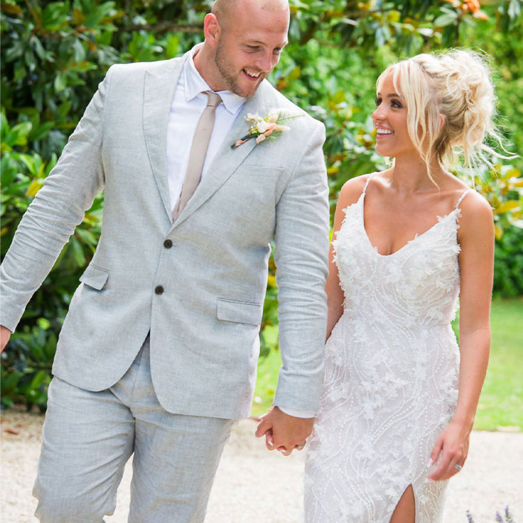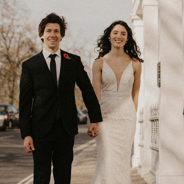 Bride Michaela walking hand-in-hand with her love, in an elegant custom made lace wedding dress.