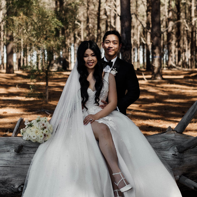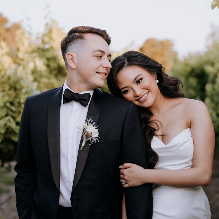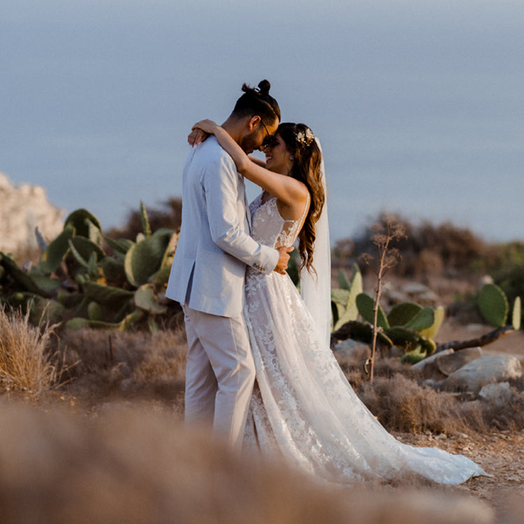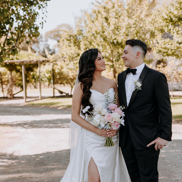 Bride and groom share a moment in a scenic setting, with the bride in a stunning Bridal Melody gown. Perfect for outdoor wedding inspiration.