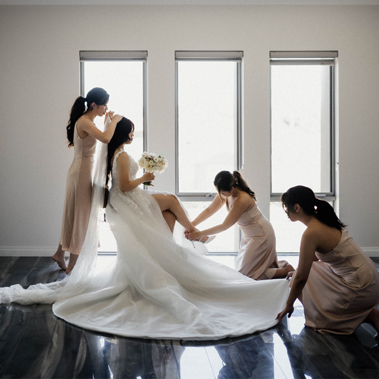 Bride Jenna adjusts shoes in chic BridalMelody gown, capturing preparation moments.