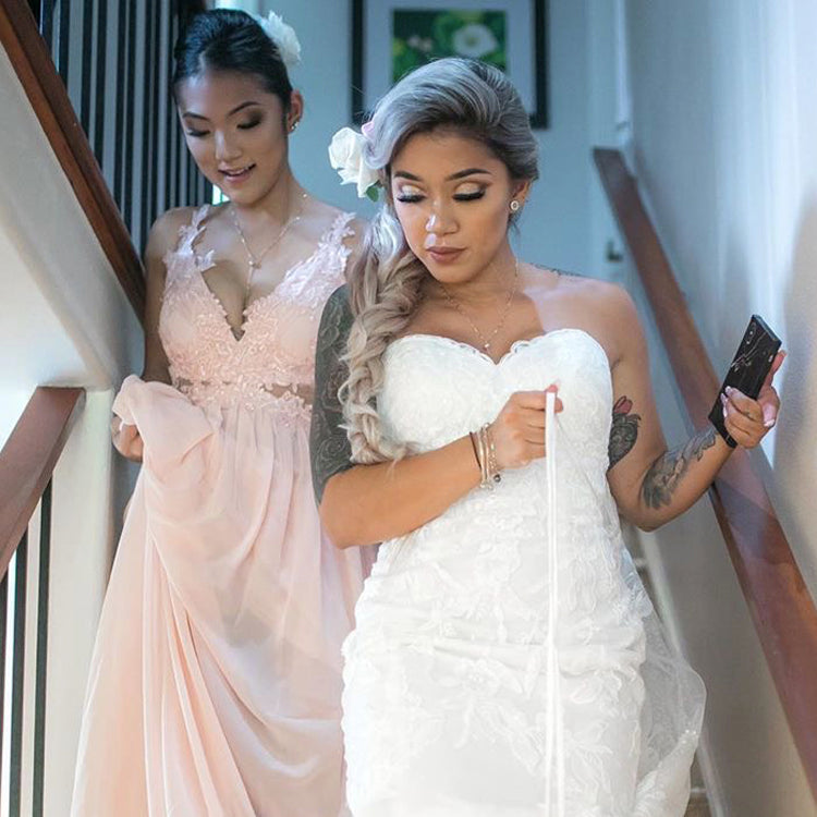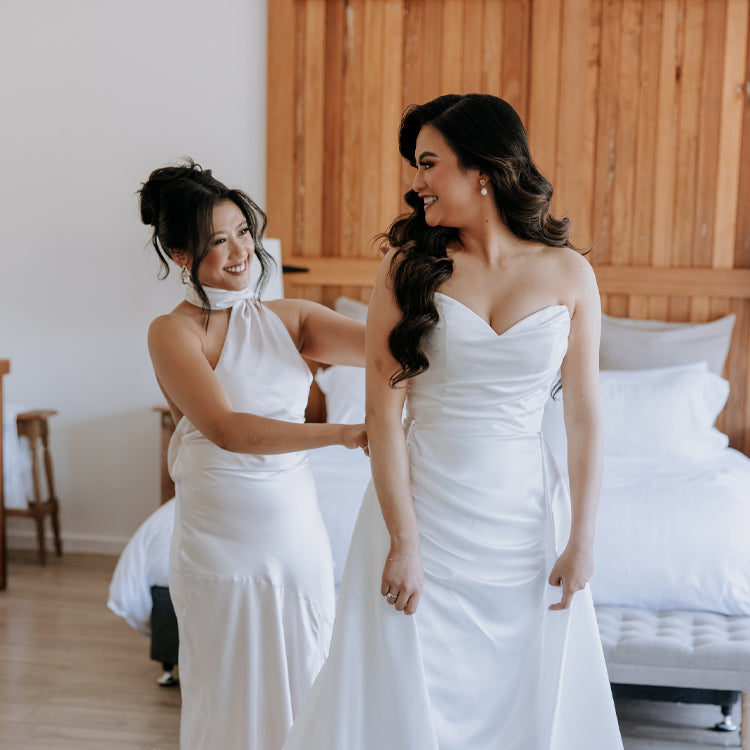 Bride Tammy getting ready, assisted by her bridesmaid, showcasing the elegant gown.