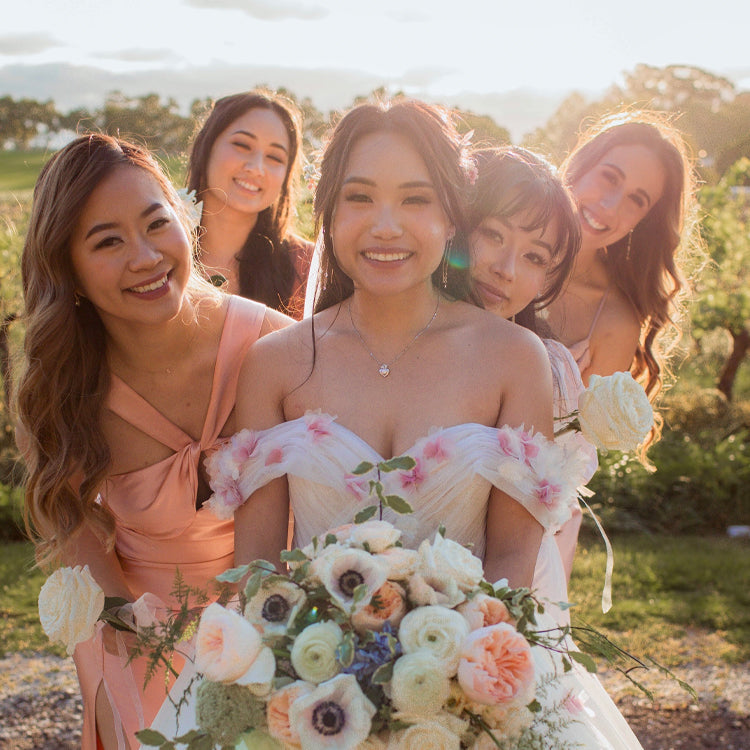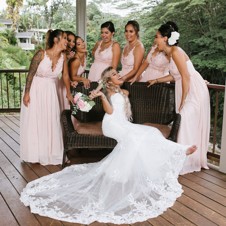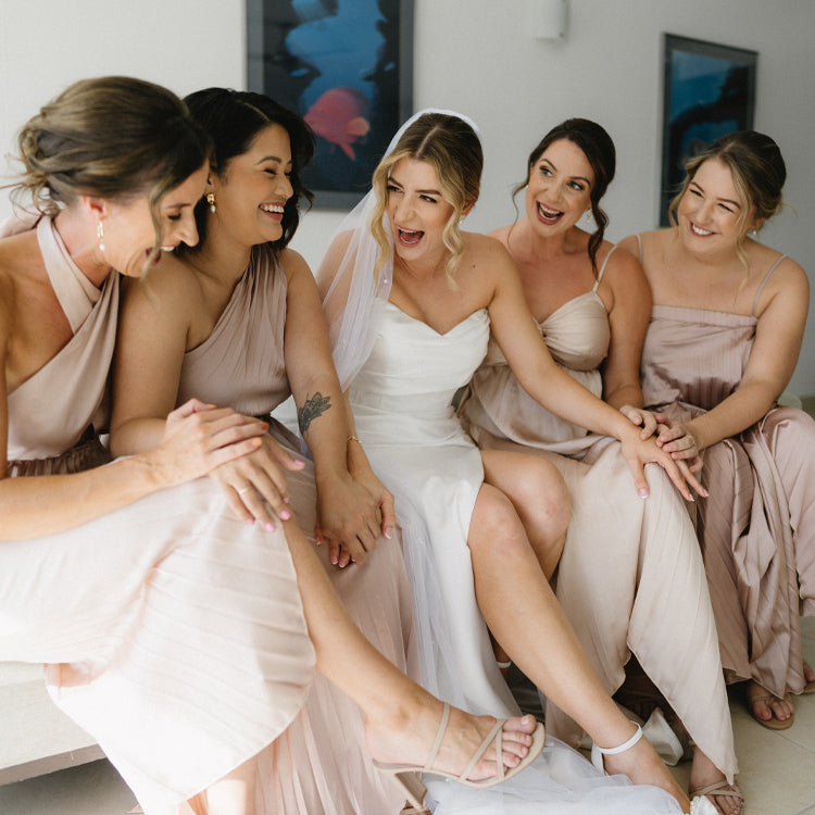 Bride laughing with bridesmaids in blush dresses, perfect for happy wedding moments.
