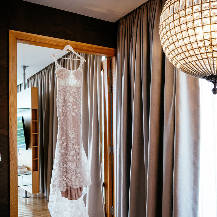 Elegant BridalMelody lace dress in a stylish room, ideal for bespoke wedding fashion.