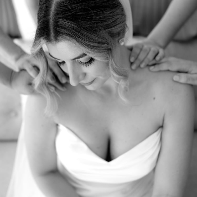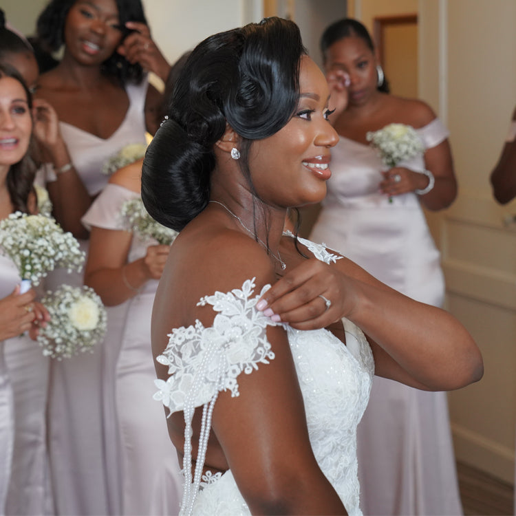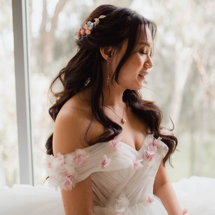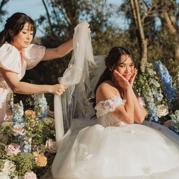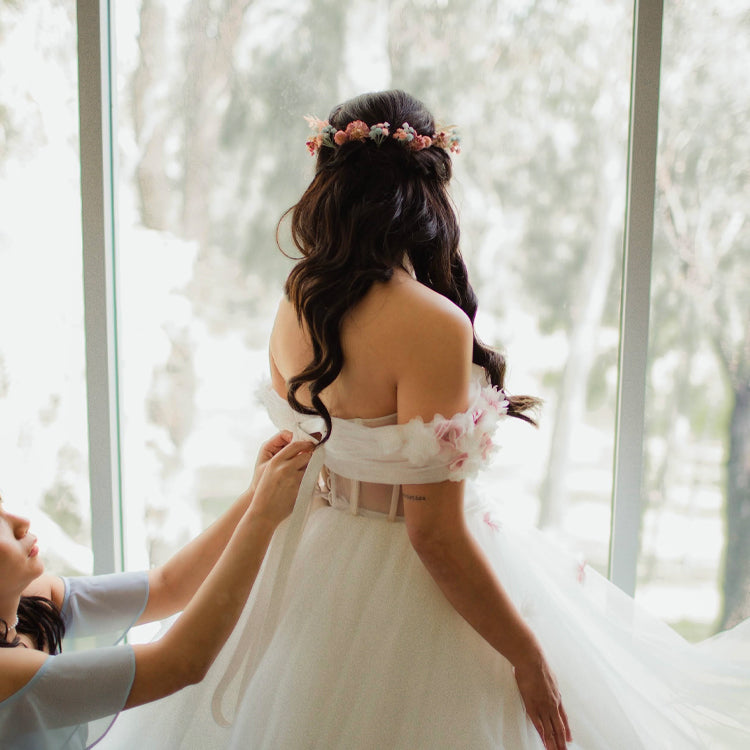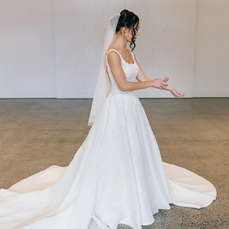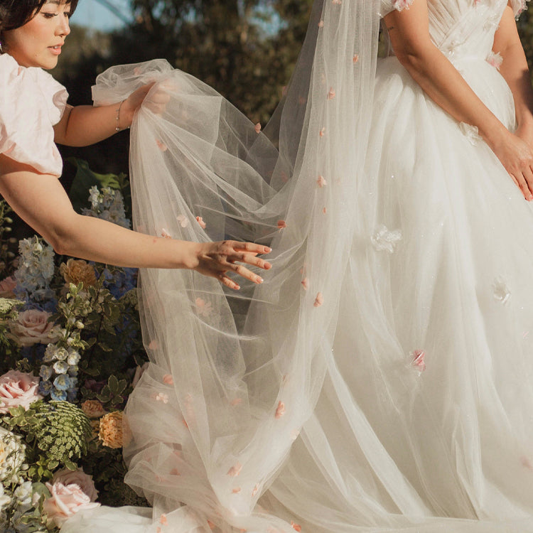 Adjusting the intricate veil of a Bridal Melody wedding gown. Ideal for highlighting delicate bridal accessories and custom dress details.