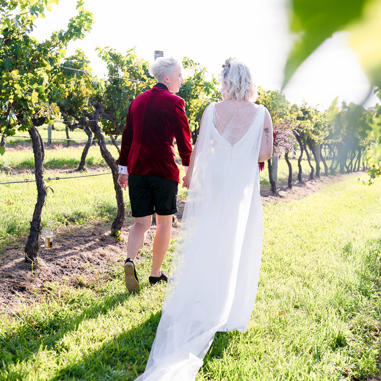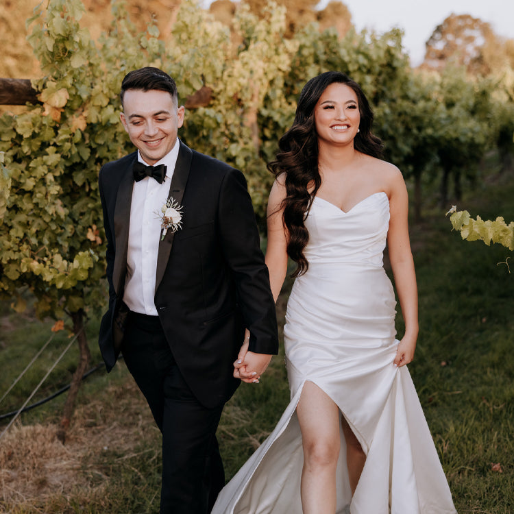Couple walking hand-in-hand through vineyard, featuring a stunning BridalMelody gown.