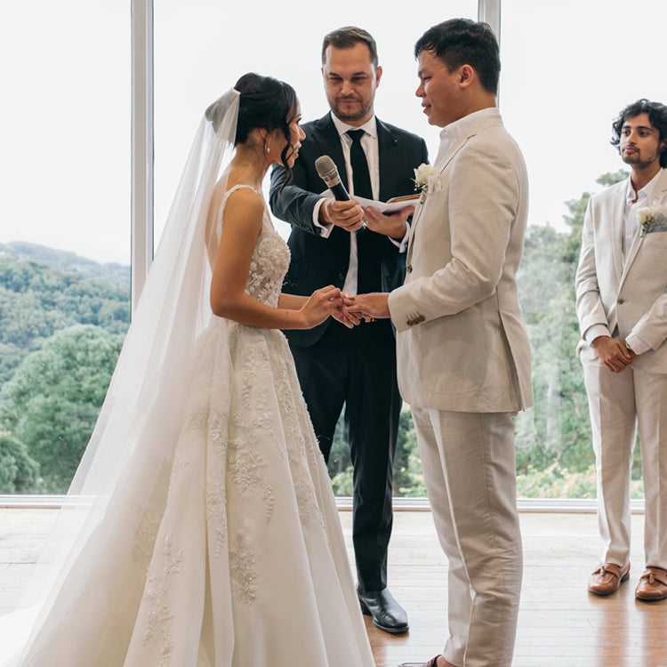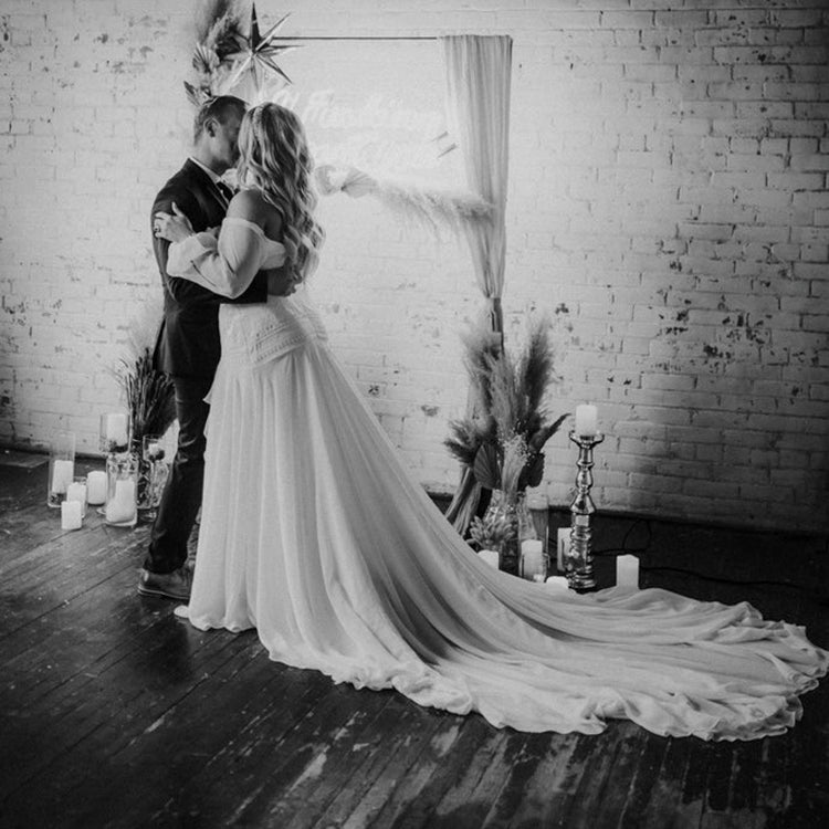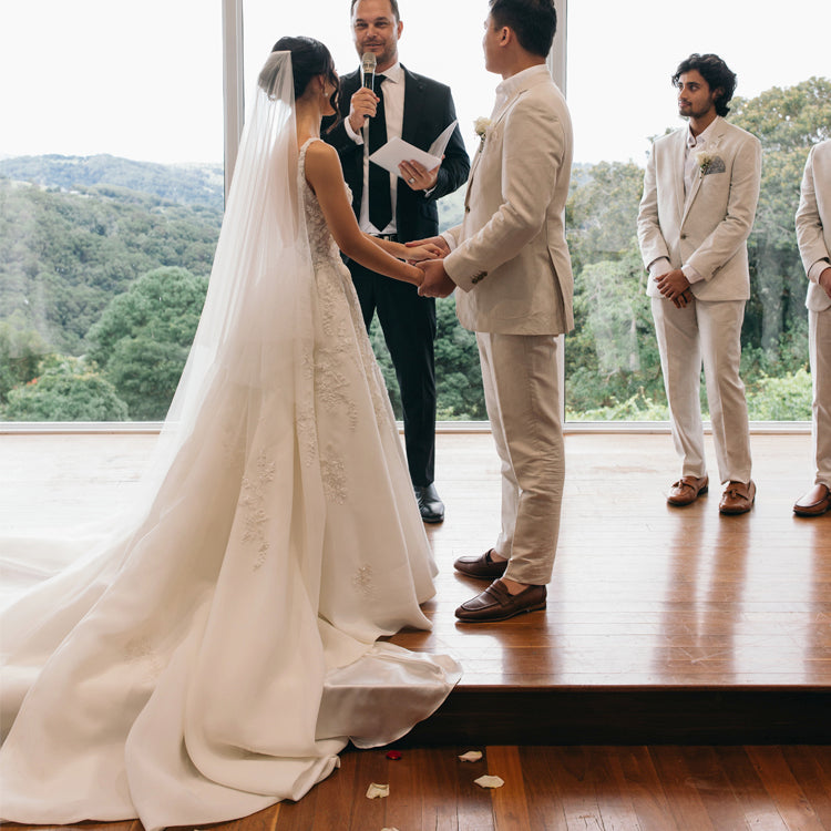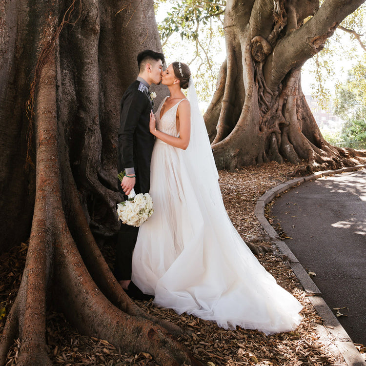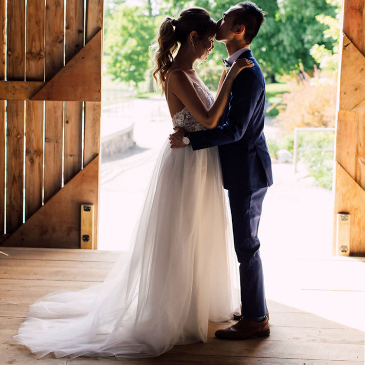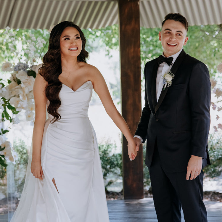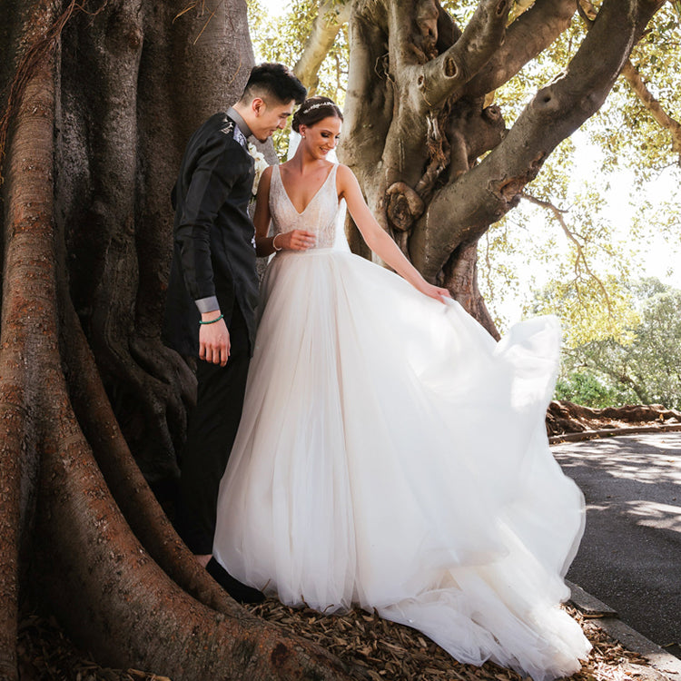 BridalMelody couple standing under a pavilion, showcasing an elegant wedding dress with detachable train.
