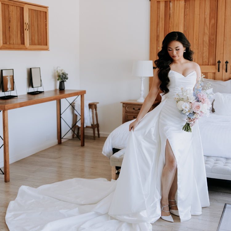 Bride in BridalMelody gown holding bouquet, highlighting the dress's long train and side slit.