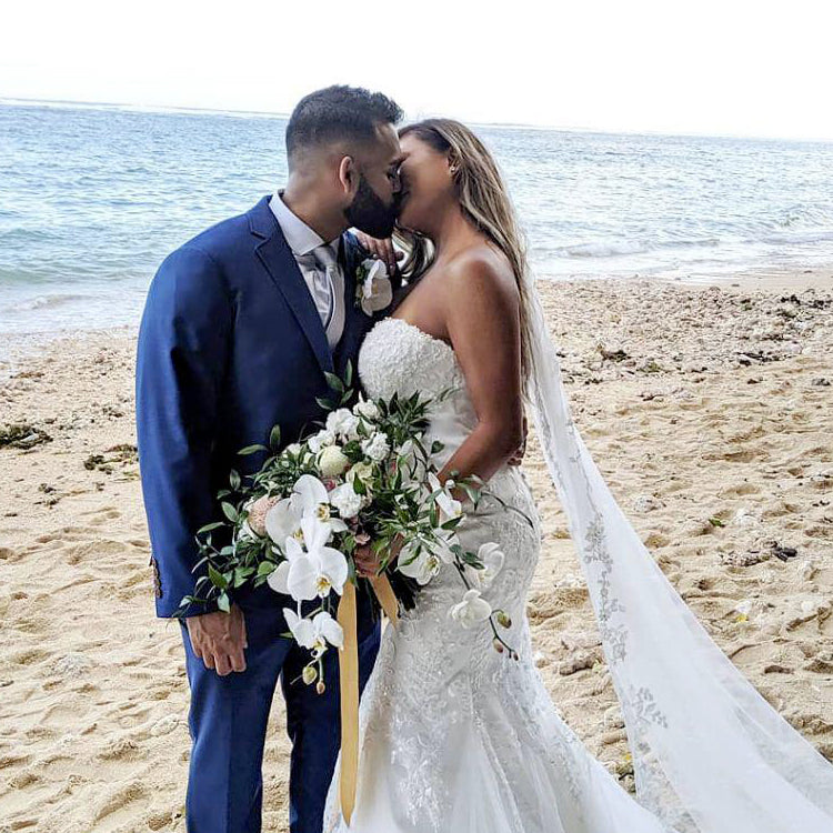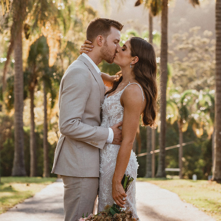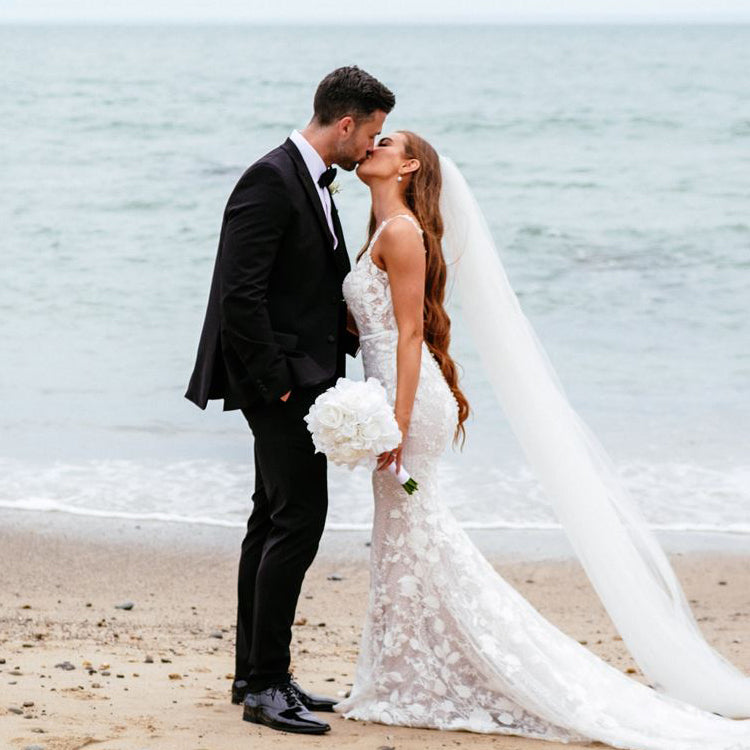 Couple shares a kiss on the beach, highlighting a custom lace wedding dress.