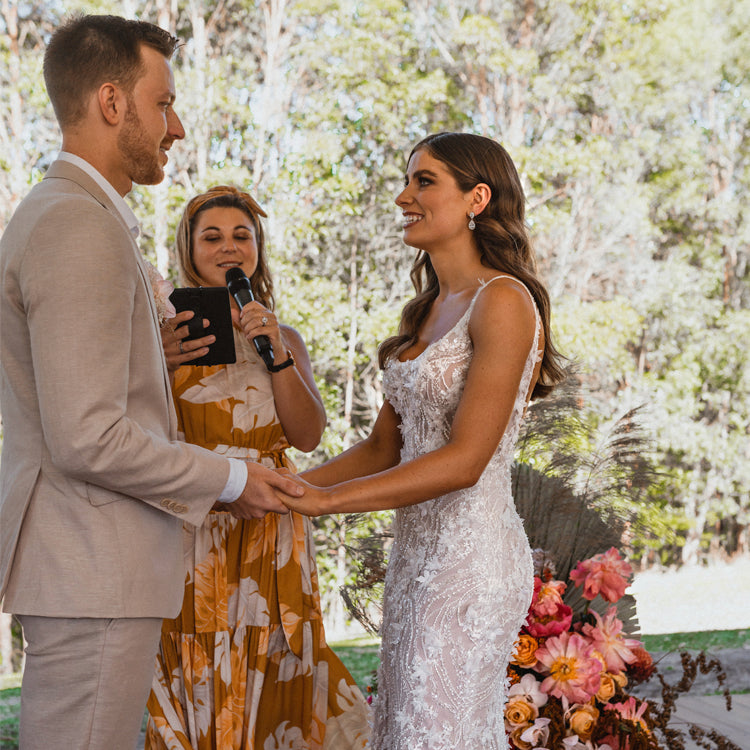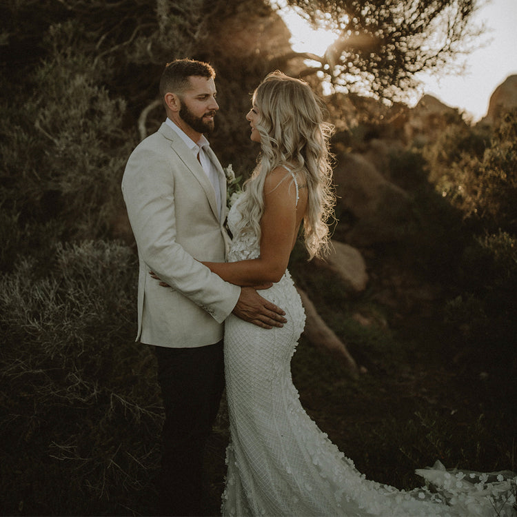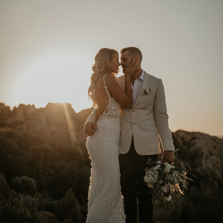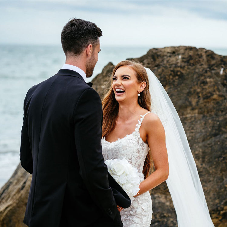 Bride laughing with groom by rocks, featuring a custom lace wedding dress.