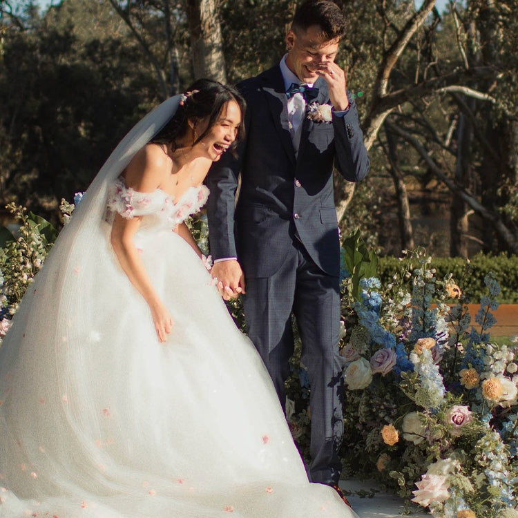 Joyful bride among flowers in a whimsical Bridal Melody gown. Highlights the beauty of custom wedding dresses in outdoor settings.