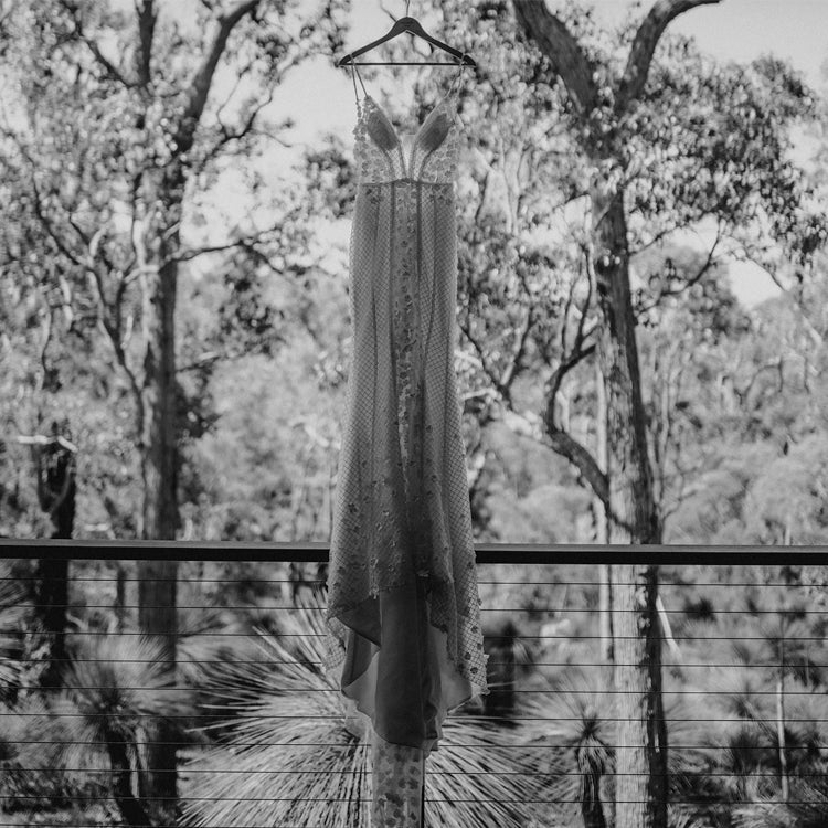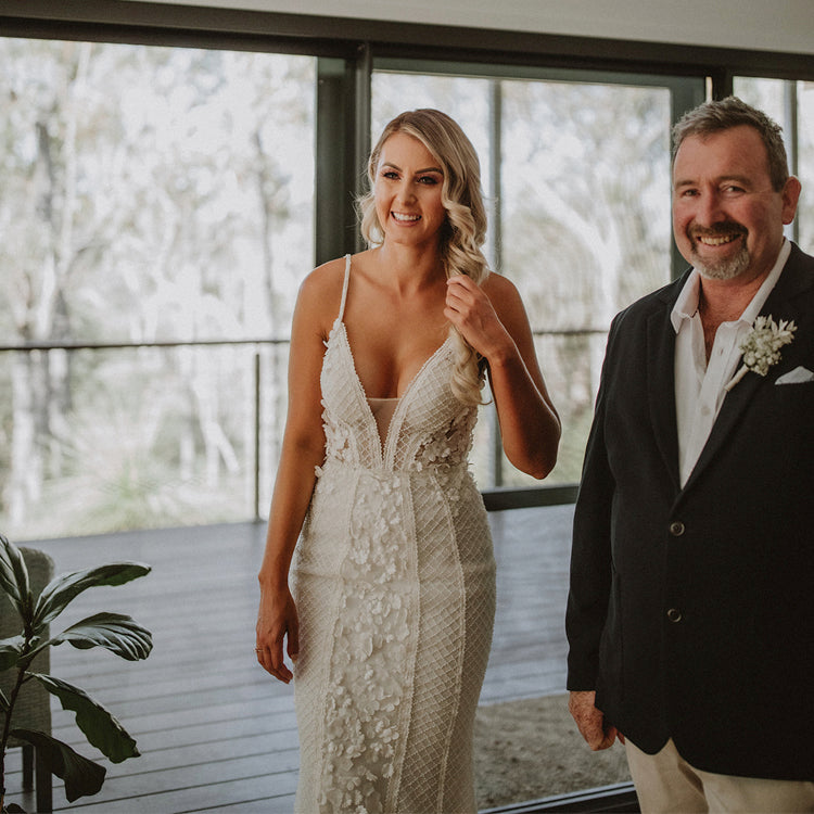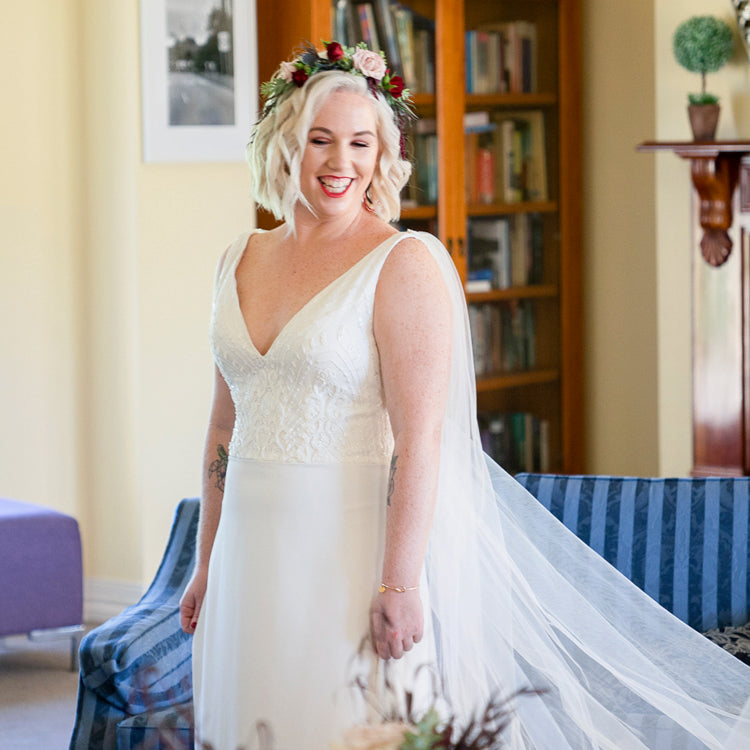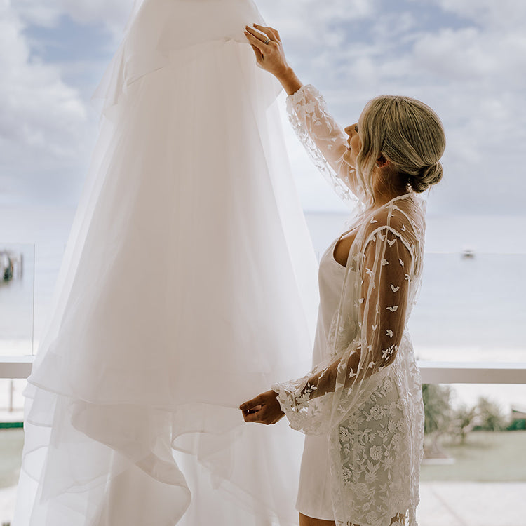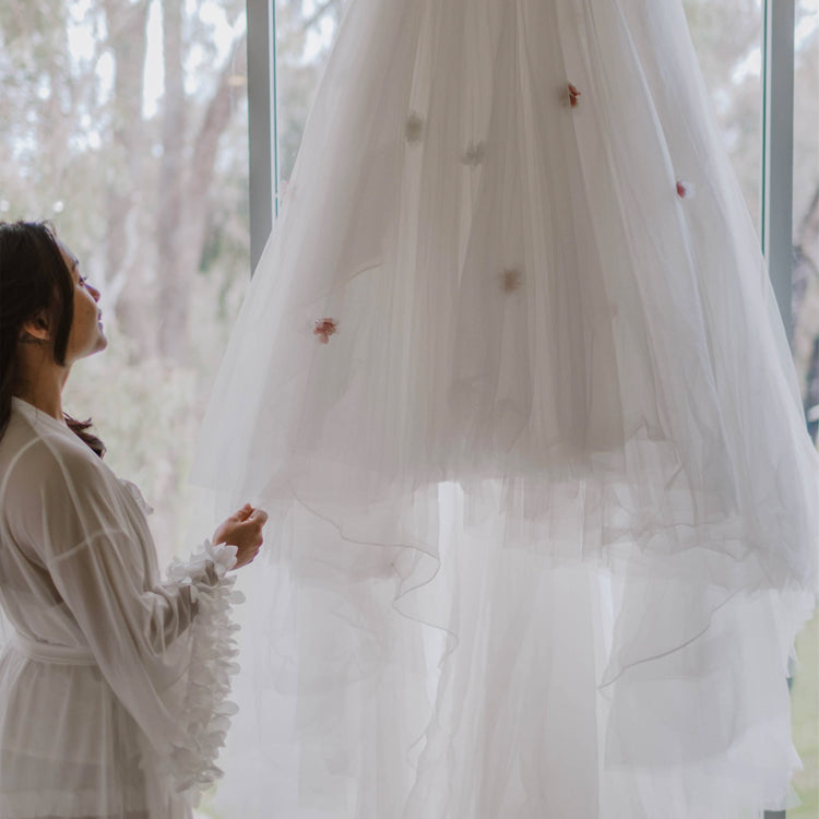 Melody admires her custom floral wedding dress. A perfect photo for showcasing bespoke bridal gowns and wedding preparation.