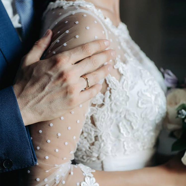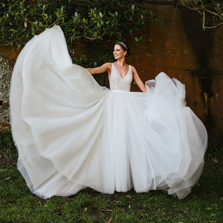 Adding an extra layer of sequined tulle underneath can make a significant difference on your wedding dress.
