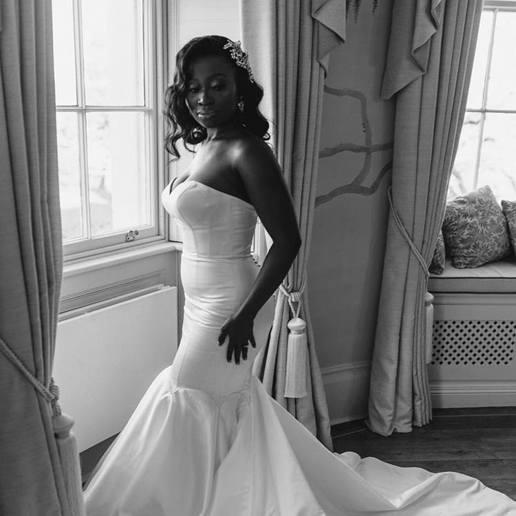 Magdalene looks gorgeous in her custom made satin wedding dress.