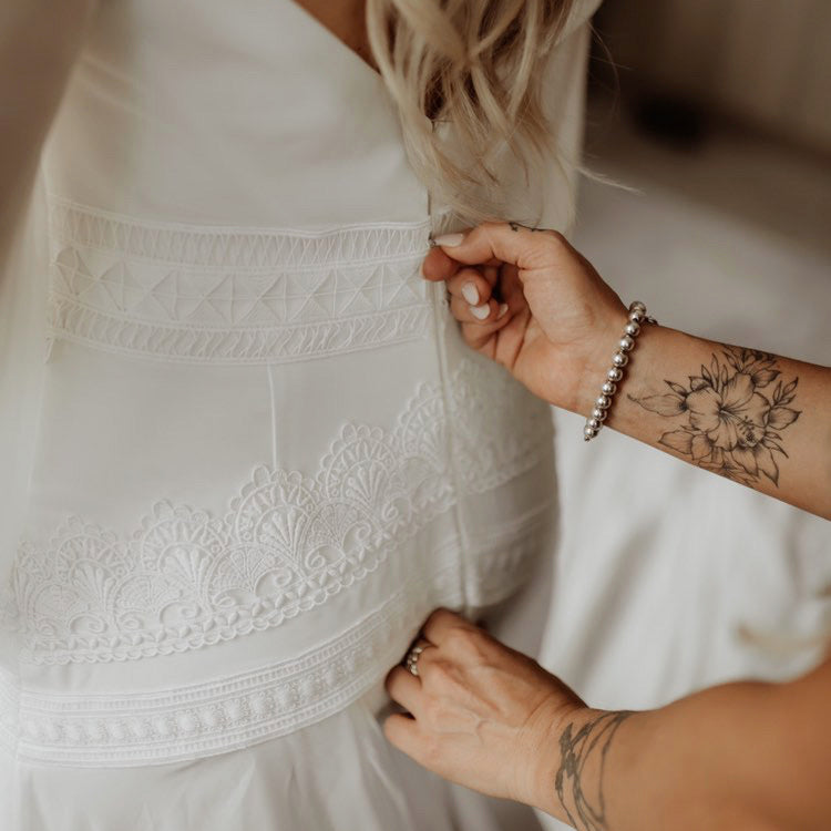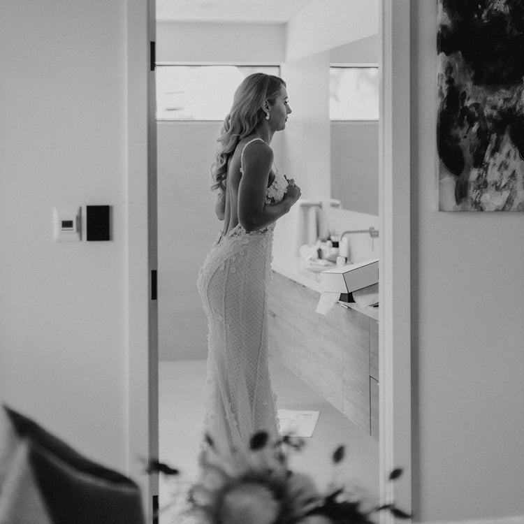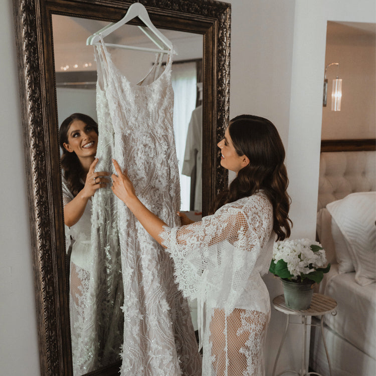 Bride Hazel getting ready, adjusting her custom lace wedding dress for personalized preparation.