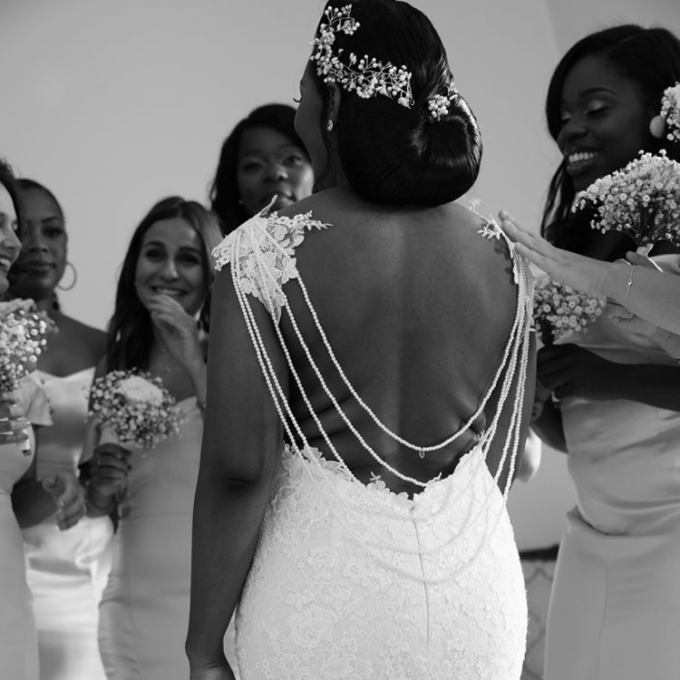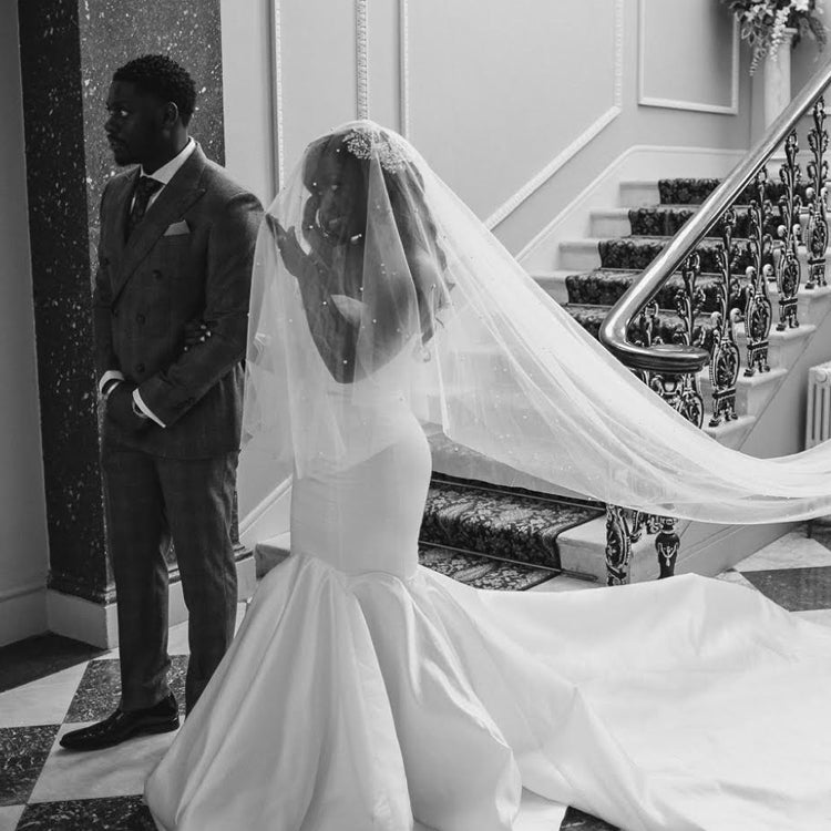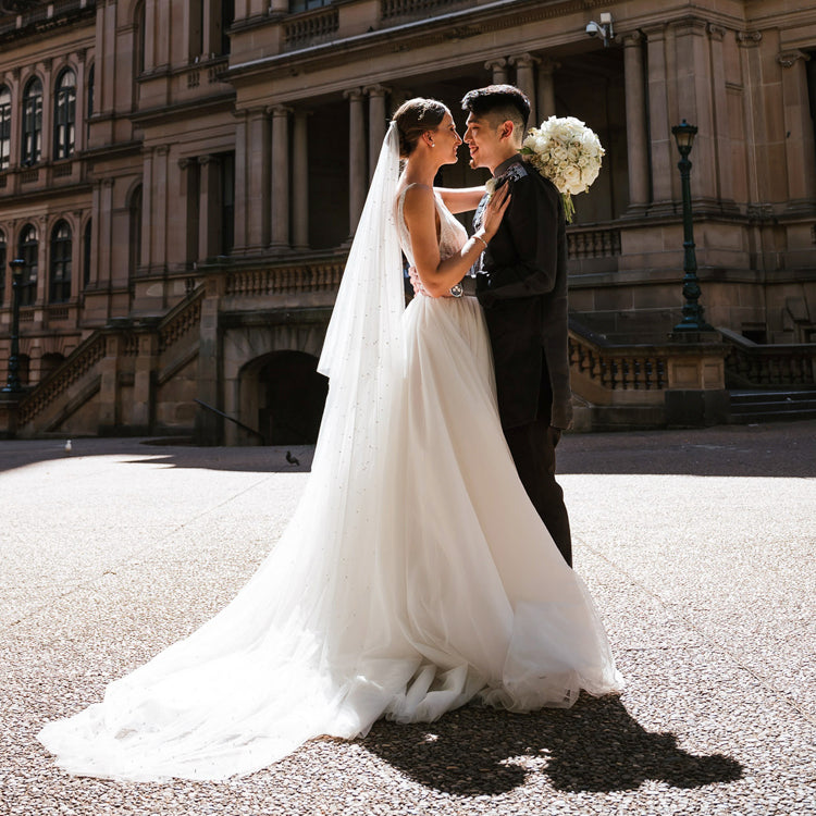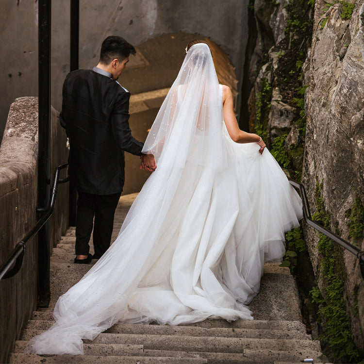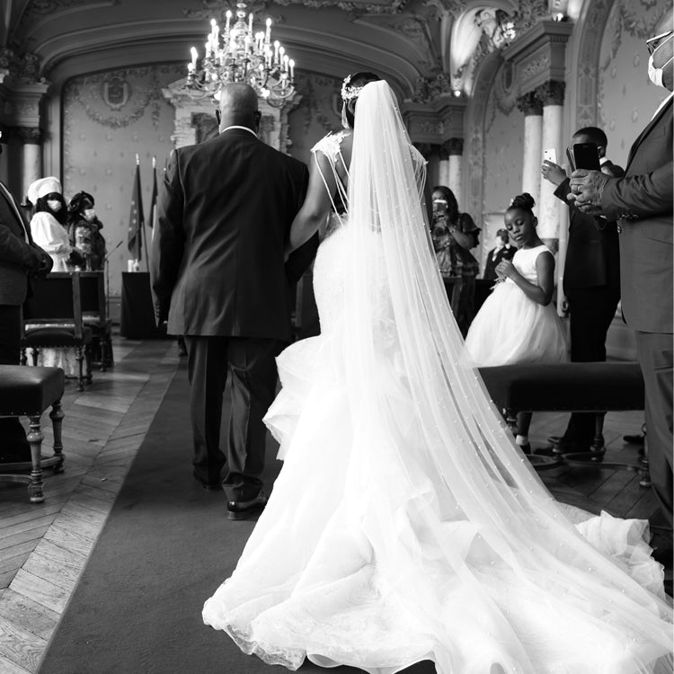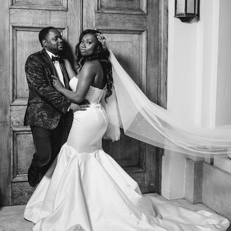 How beautiful is this moment! Our pearl veil is the perfect way to add detail to an otherwise minimal bridal look.