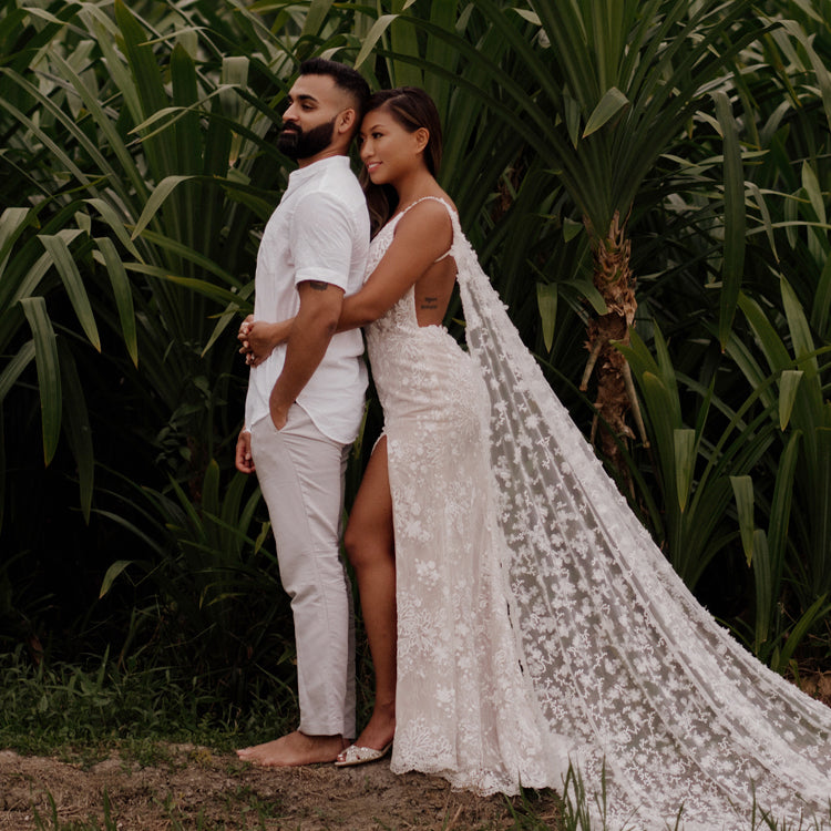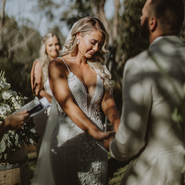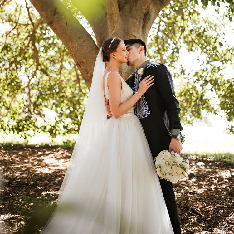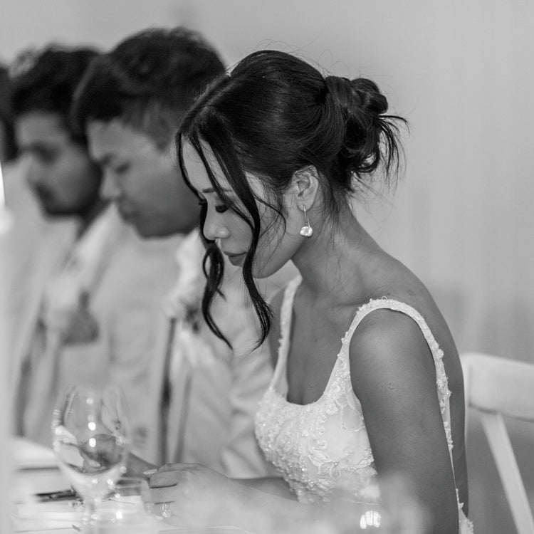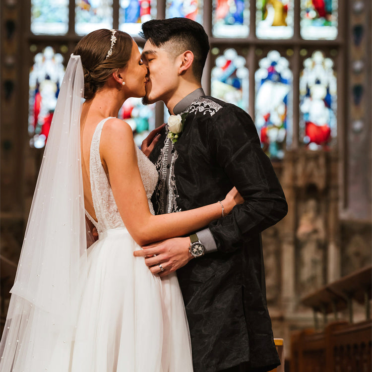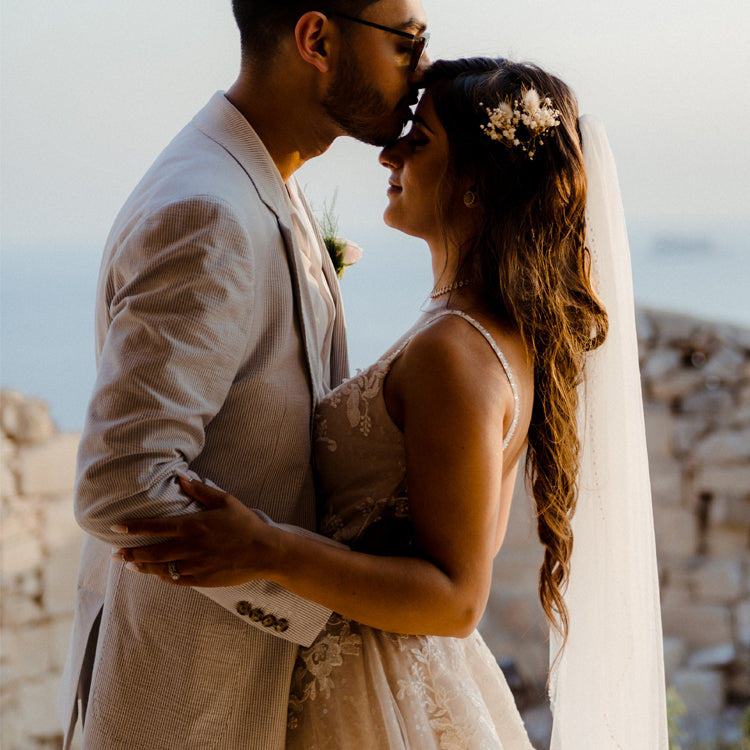 How beautiful is this moment! Our pearl veil is the perfect way to add detail to an otherwise minimal bridal look.