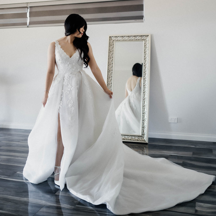 Wear an over-skirt for the ceremony & take it off for the reception. View Ada's virtual wedding dress.