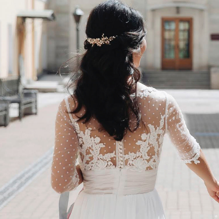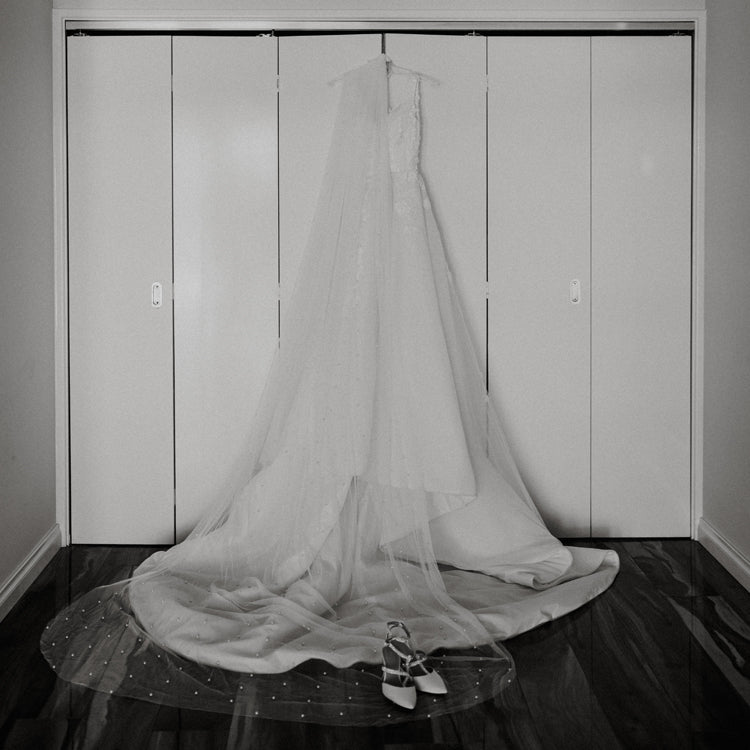 A simple but stunning pearl veil, made in soft tulle with touches of high quality pearls. It comes in custom lengths.