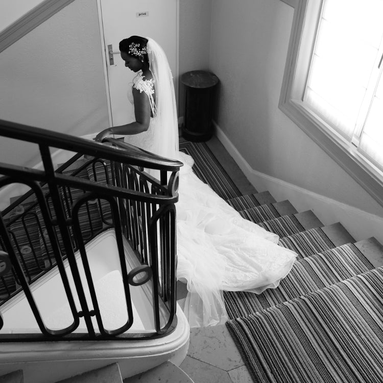 Add a loop on the underside of the train so you carry the train of the dress around your wrist.