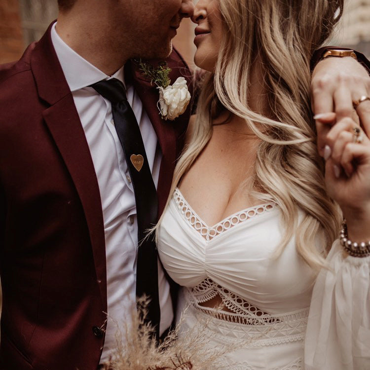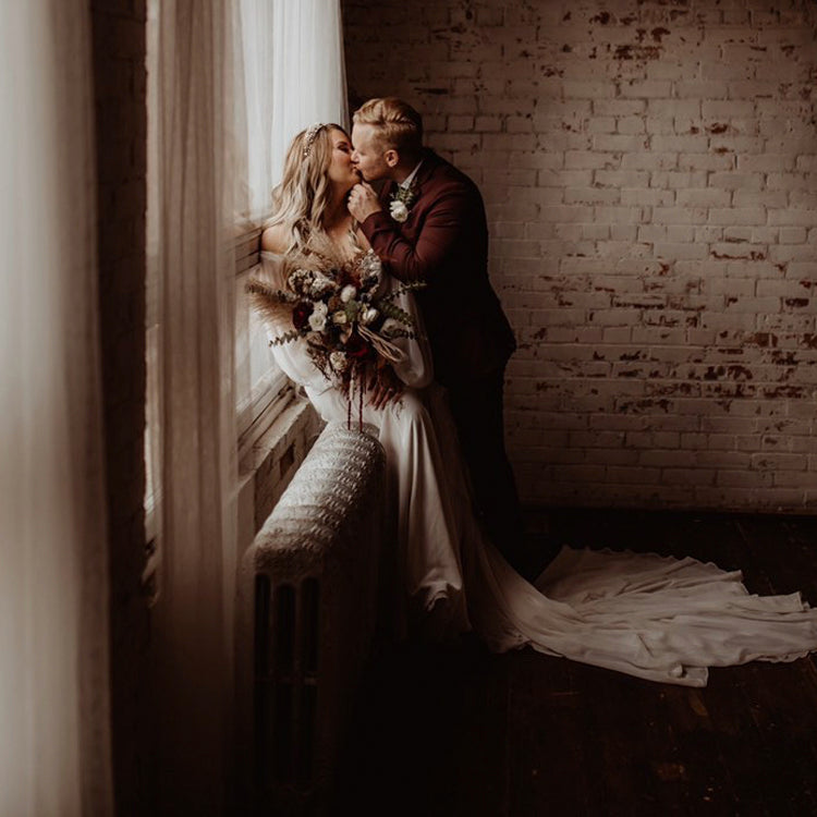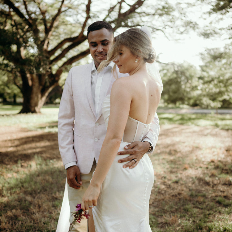 BridalMelody couple in a romantic moment, bride in a sleek satin wedding dress.