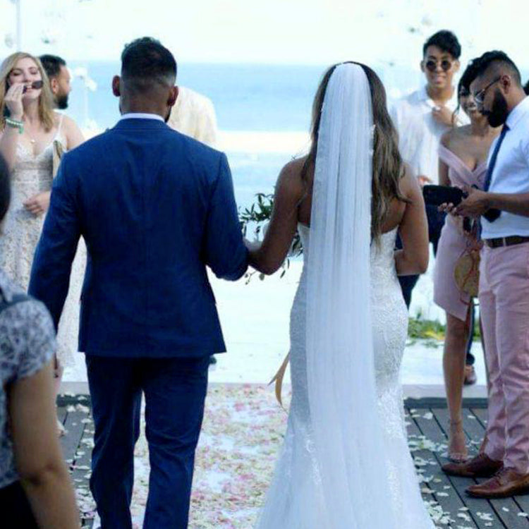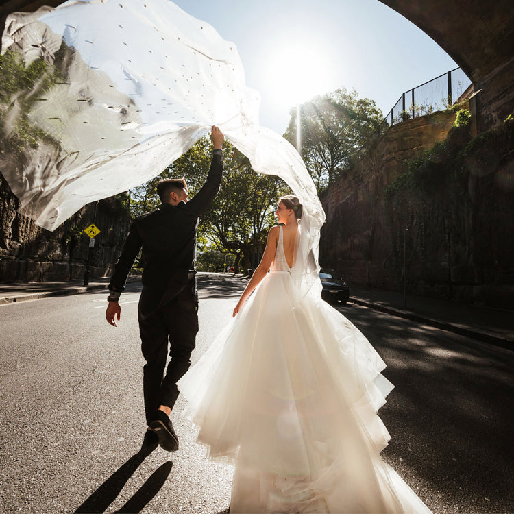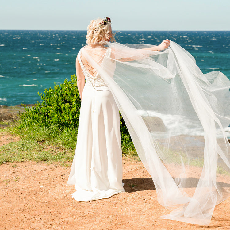 Let the beautiful tulle cape dancing in the wind. Check out Jade's virtual wedding dress.