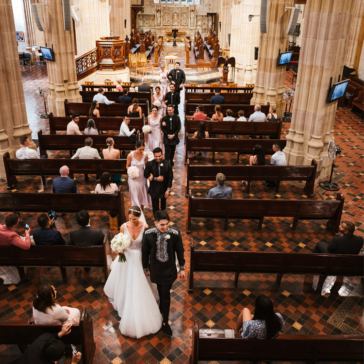 BridalMelody bride walking with groom, showcasing an elegant off-shoulder wedding dress.