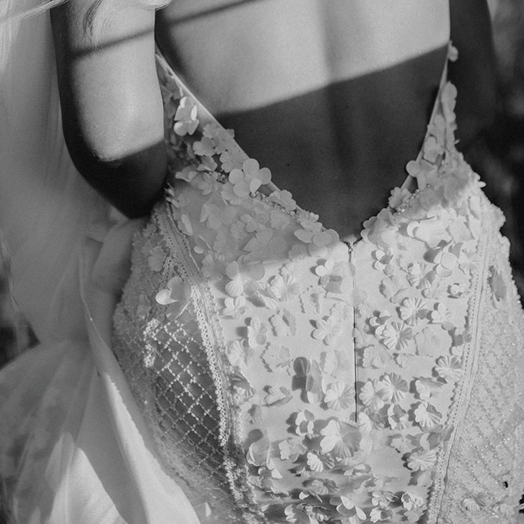 Handmade 3D flowers, embroidery beaded laces, and hand sewn pearl waistband, it's all about details...