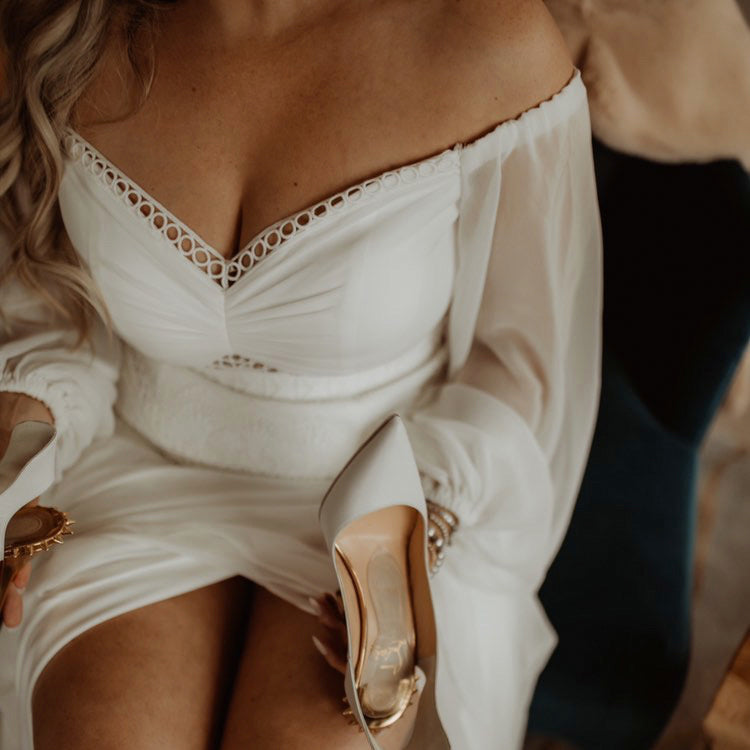 Bride adjusting shoes in elegant gown, perfect for bridal preparation inspiration.