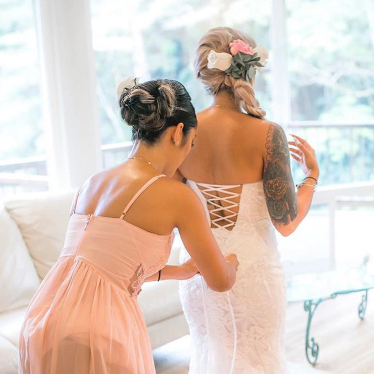 BridalMelody bride preparing in a corset wedding dress, showcasing unique bridal details.