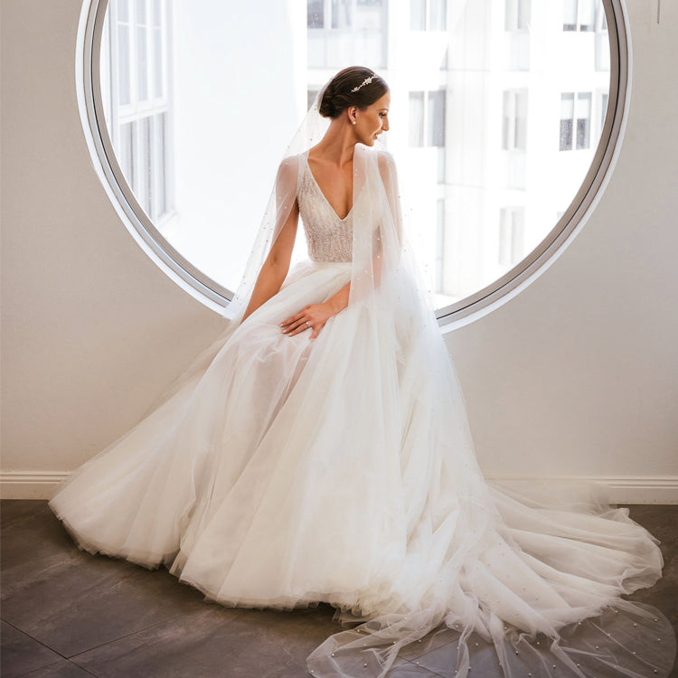 An ethereal beauty, sparking cathedral pearl bridal cape.